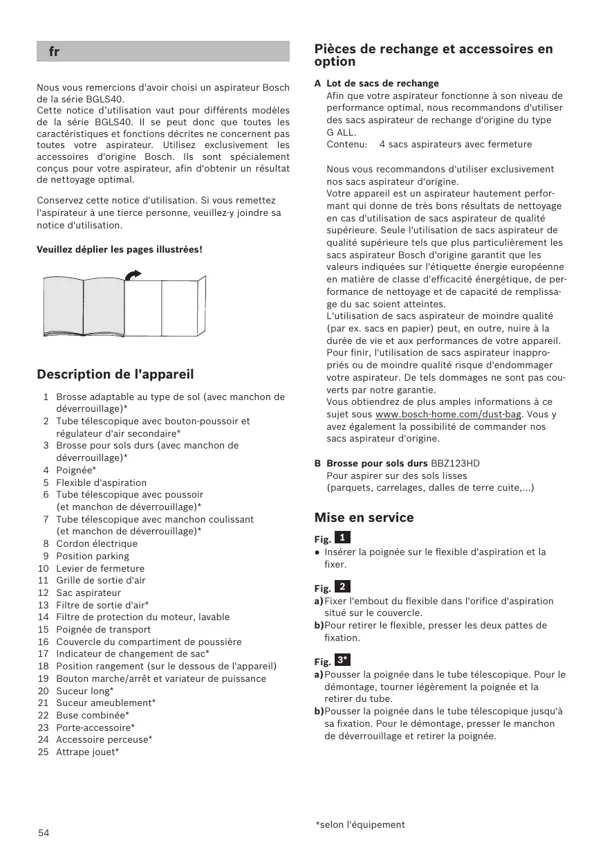 Pièces de rechange et accessoires en option A Lot de sacs de rechange Afin que votre aspirateur fonctionne à son niveau de performance optimal, nous recommandons d'utiliser des sacs aspirateur de rechange d'origine du type G ALL. Contenu: 4 sacs aspirateurs avec fermeture Nous vous recommandons d'utiliser exclusivement nos sacs aspirateur d'origine. Votre appareil est un aspirateur hautement performant qui donne de très bons résultats de nettoyage en cas d'utilisation de sacs aspirateur de qualité supérieure. Seule l'utilisation de sacs aspirateur de qualité supérieure tels que plus particulièrement les sacs aspirateur Bosch d'origine garantit que les valeurs indiquées sur l'étiquette énergie européenne en matière de classe d'efficacité énergétique, de performance de nettoyage et de capacité de remplissage du sac soient atteintes. L'utilisation de sacs aspirateur de moindre qualité (par ex. sacs en papier) peut, en outre, nuire à la durée de vie et aux performances de votre appareil. Pour finir, l'utilisation de sacs aspirateur inappropriés ou de moindre qualité risque d'endommager votre aspirateur. De tels dommages ne sont pas couverts par notre garantie. Vous obtiendrez de plus amples informations à ce sujet sous www.bosch-home.com/dust-bag. Vous y avez également la possibilité de commander nos sacs aspirateur d'origine. B Brosse pour sols durs BBZ123HD Pour aspirer sur des sols lisses (parquets, carrelages, dalles de terre cuite,...) Mise en service Fig. 1 ● Insérer la poignée sur le flexible d'aspiration et la fixer. Fig. 2 a)Fixer l'embout du flexible dans l'orifice d'aspiration situé sur le couvercle. b)Pour retirer le flexible, presser les deux pattes de fixation. Fig. 3* a)Pousser la poignée dans le tube télescopique. Pour le démontage, tourner légèrement la poignée et la retirer du tube. b)Pousser la poignée dans le tube télescopique jusqu'à sa fixation. Pour le démontage, presser le manchon de déverrouillage et retirer la poignée. *selon l'équipement Fig. 4* a)Pousser le tube télescopique dans le manchon de la brosse pour sols. Pour le démontage, tourner légèrement le tube et le retirer de la brosse pour sols. b)Pousser le tube télescopique dans le manchon de la brosse pour sols jusqu'à sa fixation. Pour le démontage, presser le manchon de déverrouillage et retirer le tube télescopique. Fig. 5* ● Déverrouiller le tube télescopique en tirant le manchon coulissant / poussoir dans le sens de la flèche et régler le tube à la longueur désirée. Fig. 6* ● Glisser le porte-accessoires sur la buse combinée et l’attacher sur le tube d’aspiration/télescopique. Fig. 7* ● Fixer le porte-accessoires dans la position désirée sur le tube télescopique. ● Insérer par le haut ou le bas le suceur ameublement et le suceur long dans le porte-accessoires en exerçant une légère pression. Fig. 8 ● Saisir le cordon électrique par la fiche, le tirer à la longueur désirée et brancher la fiche. Fig. 9 Mise sous/hors tension ● Allumer l'aspirateur en poussant le bouton marche / arrêt dans le sens de la flèche. Fig. 10 Réglage de la puissance d'aspiration La puissance d'aspiration désirée peut être réglée en continu en tournant le bouton de réglage dans le sens de la flèche. Plage de faible puissance Pour le nettoyage de matières délicates, telles que tissus, voilages, rembourrages, etc. . Plage de puissance moyenne Pour le nettoyage quotidien en cas de faible salissure. Plage de puissance élevée Pour le nettoyage de revêtements de sol Réglage de la puissance d'aspirationrobustes, sols durs et en cas de salissure importante. Fig. 11* Tube télescopique avec bouton-poussoir et régulateur d'air secondaire La puissance d'aspiration peut également être réglée en tournant le régulateur d'air secondaire dans le sens de la flèche. Régulateur d'air secondaire ouvert => puissance d'aspiration réduite Régulateur d'air secondaire fermé => puissance d'aspiration maximale Aspiration ! Attention Les brosses pour sols sont soumises à une certaine usure en fonction de la nature de votre sol dur (p.ex. carrelages rustiques, rugueux. C'est pourquoi, vous devez vérifier régulièrement la semelle de la brosse. Des semelles de brosse usées, à arêtes coupantes, peuvent occasionner des dommages sur des sols durs fragiles tels que parquets ou linoléum. Le fabricant décline toute responsabilité pour d'éventuels dommages résultant d'une brosse pour sols usée. Fig. 12 Réglage de la brosse adaptable au type de sol : tapis et moquettes sols lisses