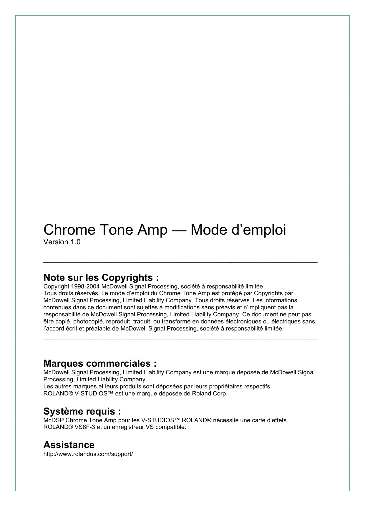Copyright 1998-2004 McDowell Signal Processing, société à responsabilité limitée. Tous droits réservés. Le mode d'emploi du Chrome Tone Amp est protégé par les droits d'auteur de McDowell Signal Processing, Limited Liability Company. Tous droits réservés. Les informations contenues dans ce document sont sujettes à modifications sans préavis et n'engagent pas la responsabilité de McDowell Signal Processing, Limited Liability Company. Ce document ne peut pas être copié, photocopié, reproduit, traduit, ou transformé en données électroniques ou électriques sans l'accord écrit et préalable de McDowell Signal Processing, société à responsabilité limitée.