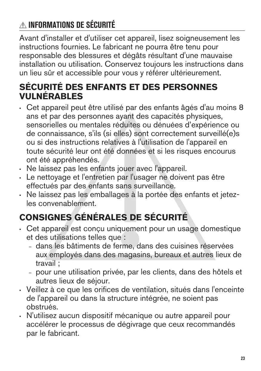 Cet appareil est conçu uniquement pour un usage domestique et des utilisations telles que : – dans les bâtiments de ferme, dans des cuisines réservées aux employés dans des magasins, bureaux et autres lieux de travail ; – pour une utilisation privée, par les clients, dans des hôtels et autres lieux de séjour. Veillez à ce que les orifices de ventilation, situés dans l'enceinte de l'appareil ou dans la structure intégrée, ne soient pas obstrués. N'utilisez aucun dispositif mécanique ou autre appareil pour accélérer le processus de dégivrage que ceux recommandés par le fabricant.