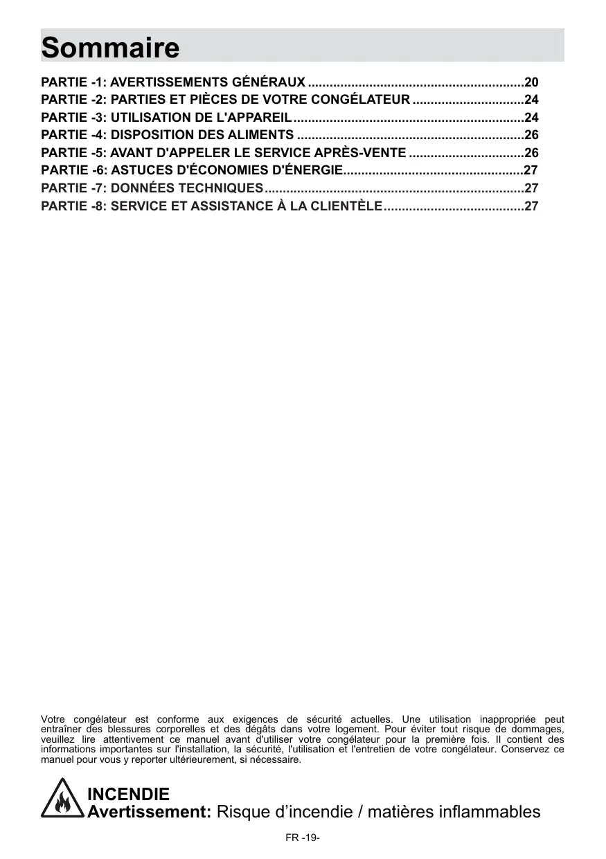 PARTIE -1: AVERTISSEMENTS GÉNÉRAUX toute sécurité à condition d’être supervisés ou d’avoir reçu des instructions appropriées concernant son utilisation. Les personnes très vulnérables ne doivent pas utiliser le congélateur à moins de faire l’objet d’une surveillance continue.