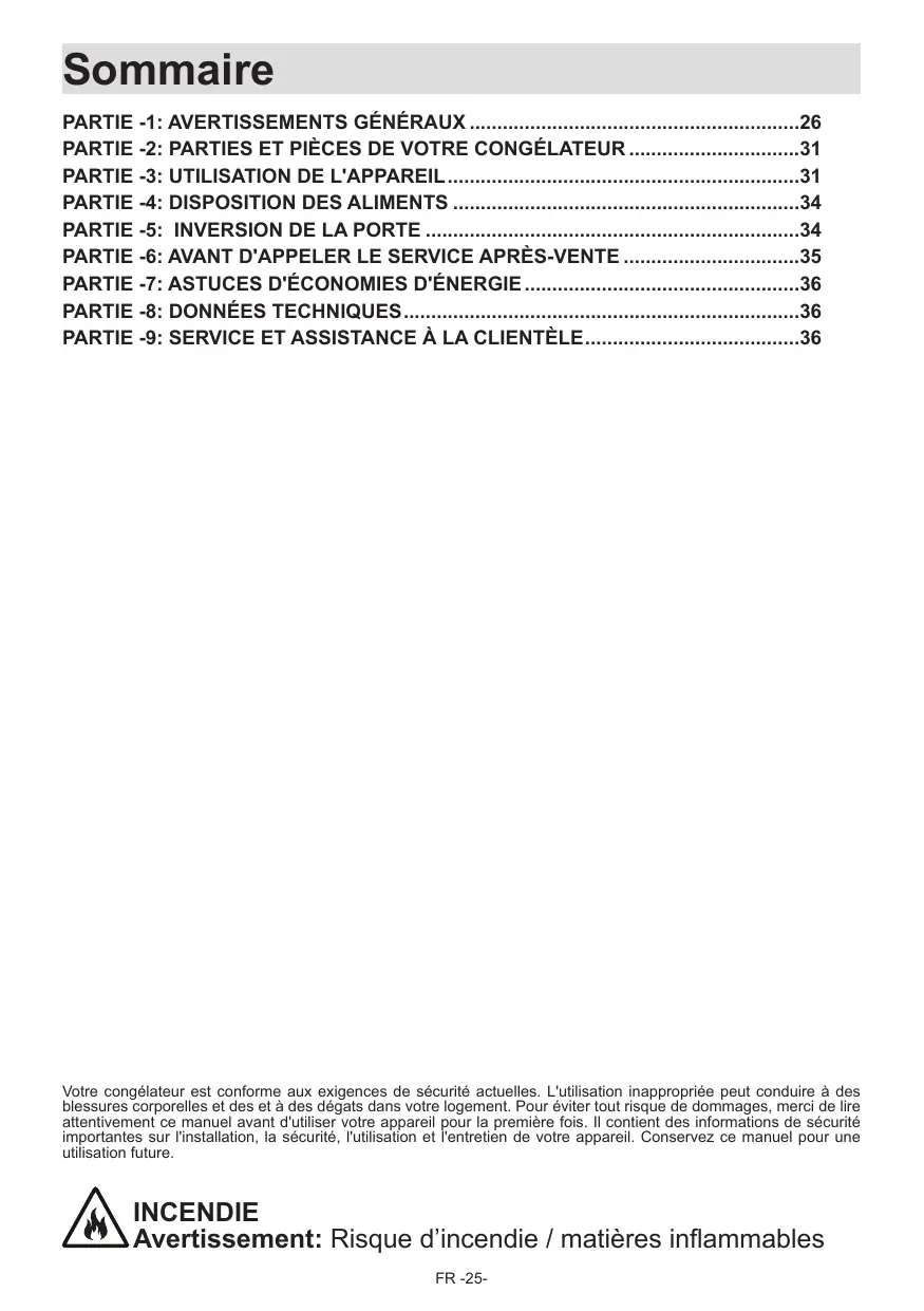 Votre congélateur est conforme aux exigences de sécurité actuelles. L'utilisation inappropriée peut conduire à des blessures corporelles et des et à des dégats dans votre logement. Pour éviter tout risque de dommages, merci de lire attentivement ce manuel avant d'utiliser votre appareil pour la première fois. Il contient des informations de sécurité importantes sur l'installation, la sécurité, l'utilisation et l'entretien de votre appareil. Conservez ce manuel pour une utilisation future.