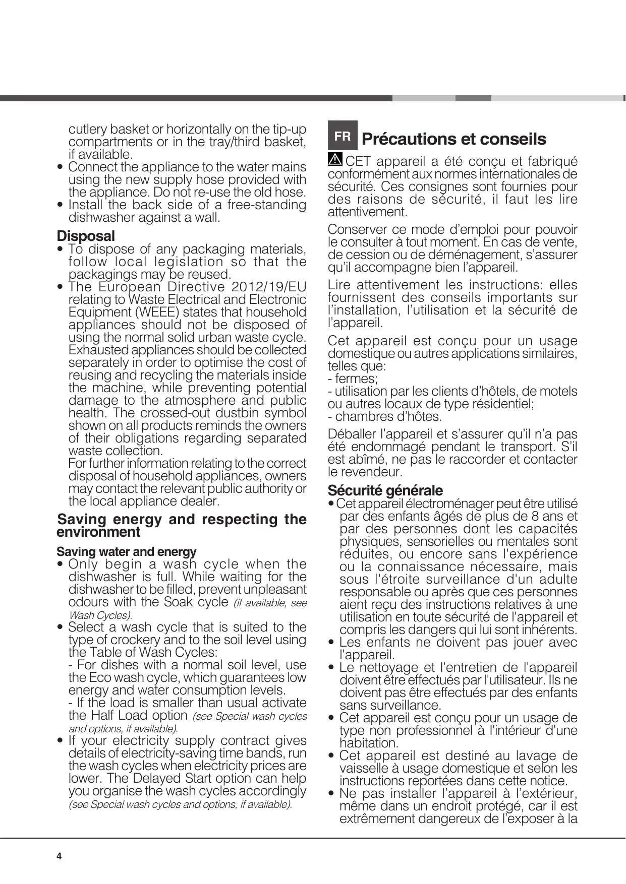 "Fast" et "Express" il est conseillé de respecter le nombre de couverts indiqué. Pour consommer moins, utiliser le lave-vaisselle à pleine charge. Note pour les laboratoires d’essai : pour toutes informations sur les conditions d’essai comparatif EN, s’adresser à: contact@whirlpool.com