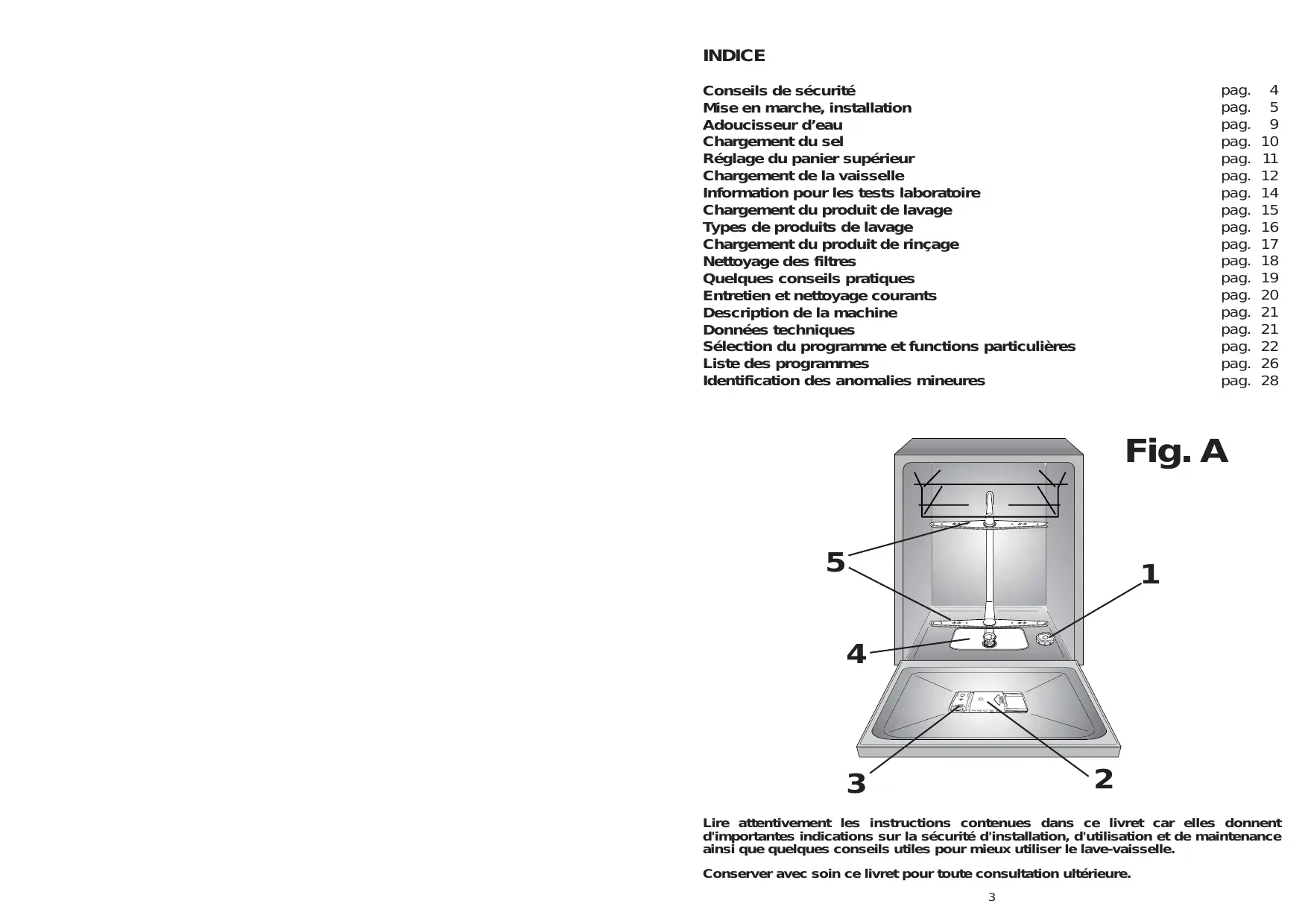Réglage du panier supérieur Chargement de la vaisselle Information pour les tests laboratoire Chargement du produit de lavage Types de produits de lavage Chargement du produit de rinçage Nettoyage des filtres Quelques conseils pratiques Entretien et nettoyage courants Description de la machine Données techniques Sélection du programme et functions particulières Liste des programmes Identification des anomalies mineures