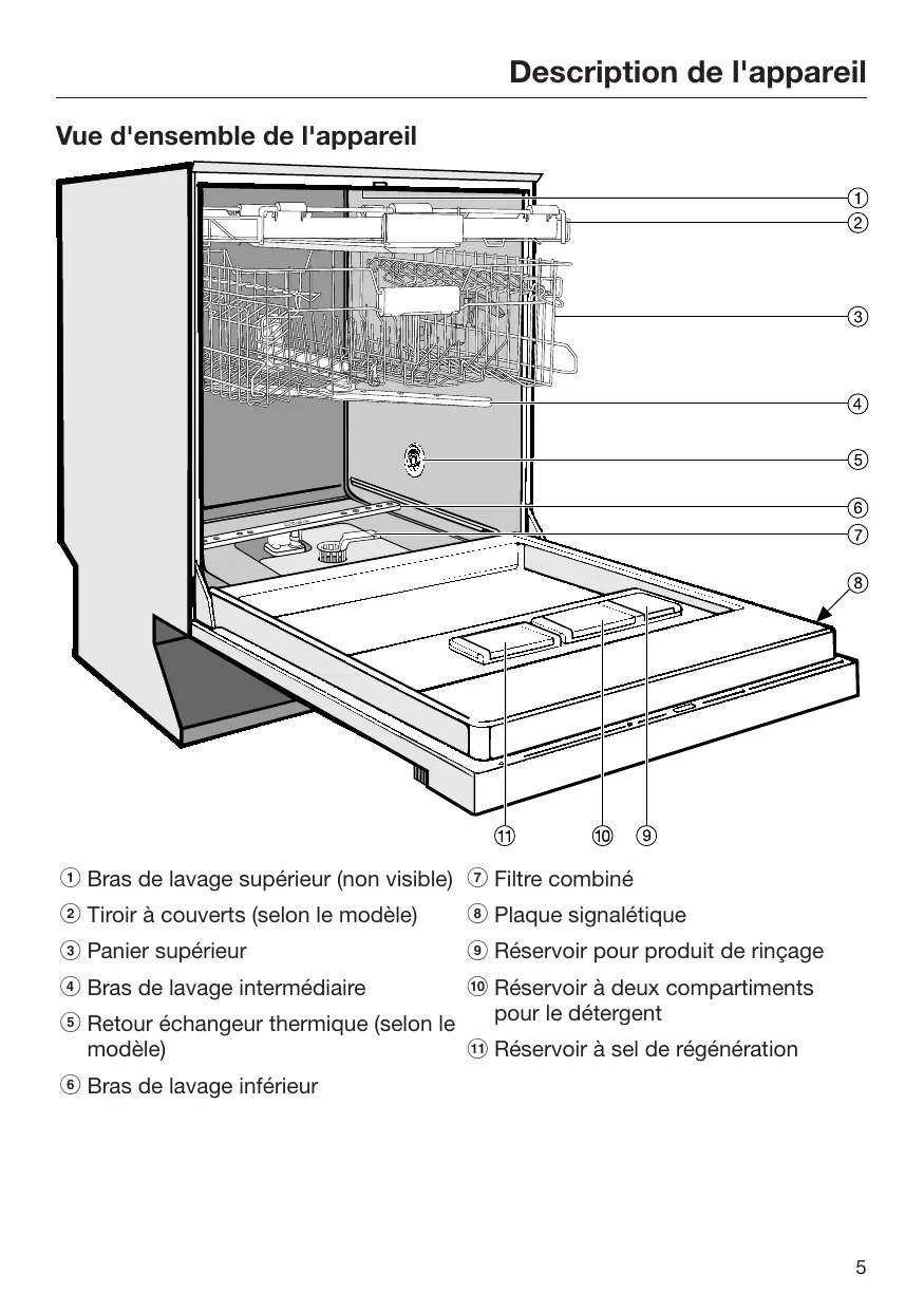 Description de l'appareil Vue d'ensemble de l'appareil a Bras de lavage supérieur (non visible) g Filtre combiné b Tiroir à couverts (selon le modèle) h Plaque signalétique c Panier supérieur i Réservoir pour produit de rinçage d Bras de lavage intermédiaire j Réservoir à deux compartiments pour le détergent e Retour échangeur thermique (selon le k Réservoir à sel de régénération modèle) f Bras de lavage inférieur
