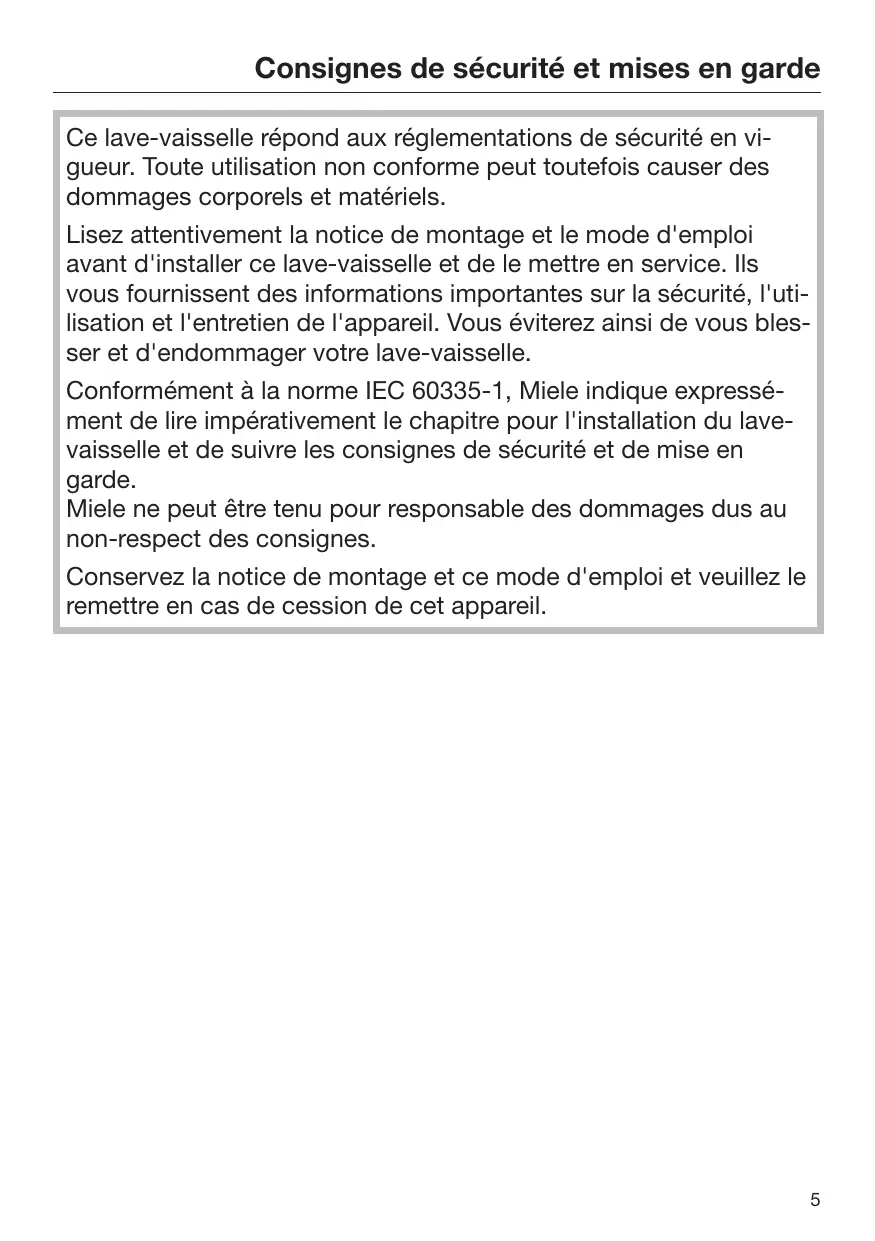 Conformément à la norme IEC 60335-1, Miele indique expressesment de litre impératifement le chapitre pour l'installation du lavevaisselle et de suivre les consignes de sécurité et de mise en garde.