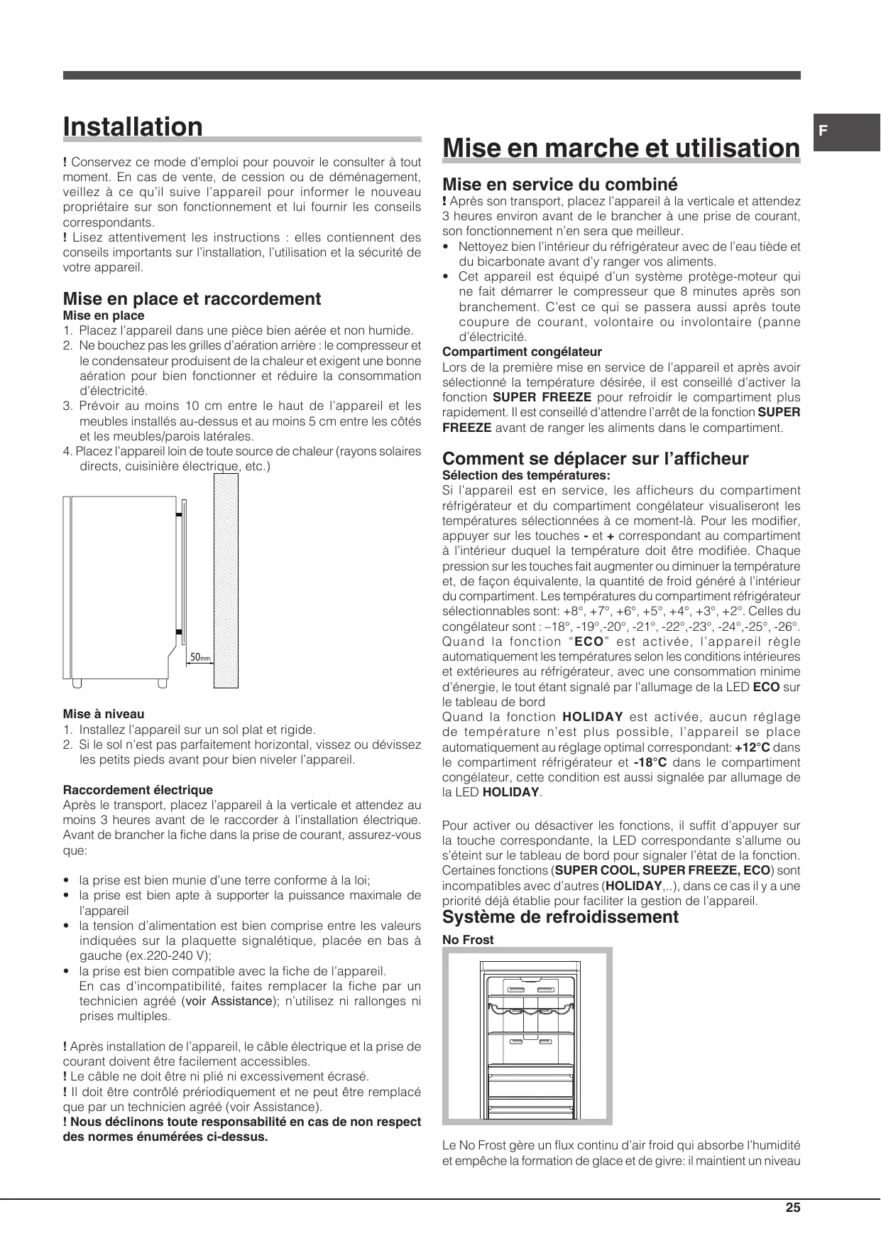 Mise à niveau 1. Installez l’appareil sur un sol plat et rigide. 2. Si le sol n’est pas parfaitement horizontal, vissez ou dévissez les petits pieds avant pour bien niveler l’appareil. Raccordement électrique Après le transport, placez l’appareil à la verticale et attendez au moins 3 heures avant de le raccorder à l’installation électrique. Avant de brancher la fiche dans la prise de courant, assurez-vous que: • la prise est bien munie d’une terre conforme à la loi; • la prise est bien apte à supporter la puissance maximale de l’appareil • la tension d’alimentation est bien comprise entre les valeurs indiquées sur la plaquette signalétique, placée en bas à gauche (ex.220-240 V); • la prise est bien compatible avec la fiche de l’appareil. En cas d’incompatibilité, faites remplacer la fiche par un technicien agréé (voir Assistance); n’utilisez ni rallonges ni prises multiples. ! Après installation de l’appareil, le câble électrique et la prise de courant doivent être facilement accessibles. ! Le câble ne doit être ni plié ni excessivement écrasé. ! Il doit être contrôlé prériodiquement et ne peut être remplacé que par un technicien agréé (voir Assistance). ! Nous déclinons toute responsabilité en cas de non respect des normes énumérées ci-dessus.