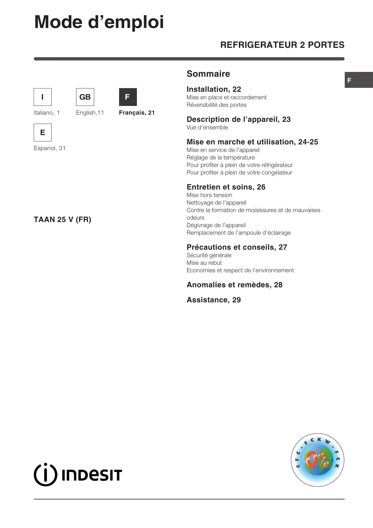 TAAN 25 V - Réfrigérateur INDESIT - Notice d'utilisation et mode d'emploi gratuit