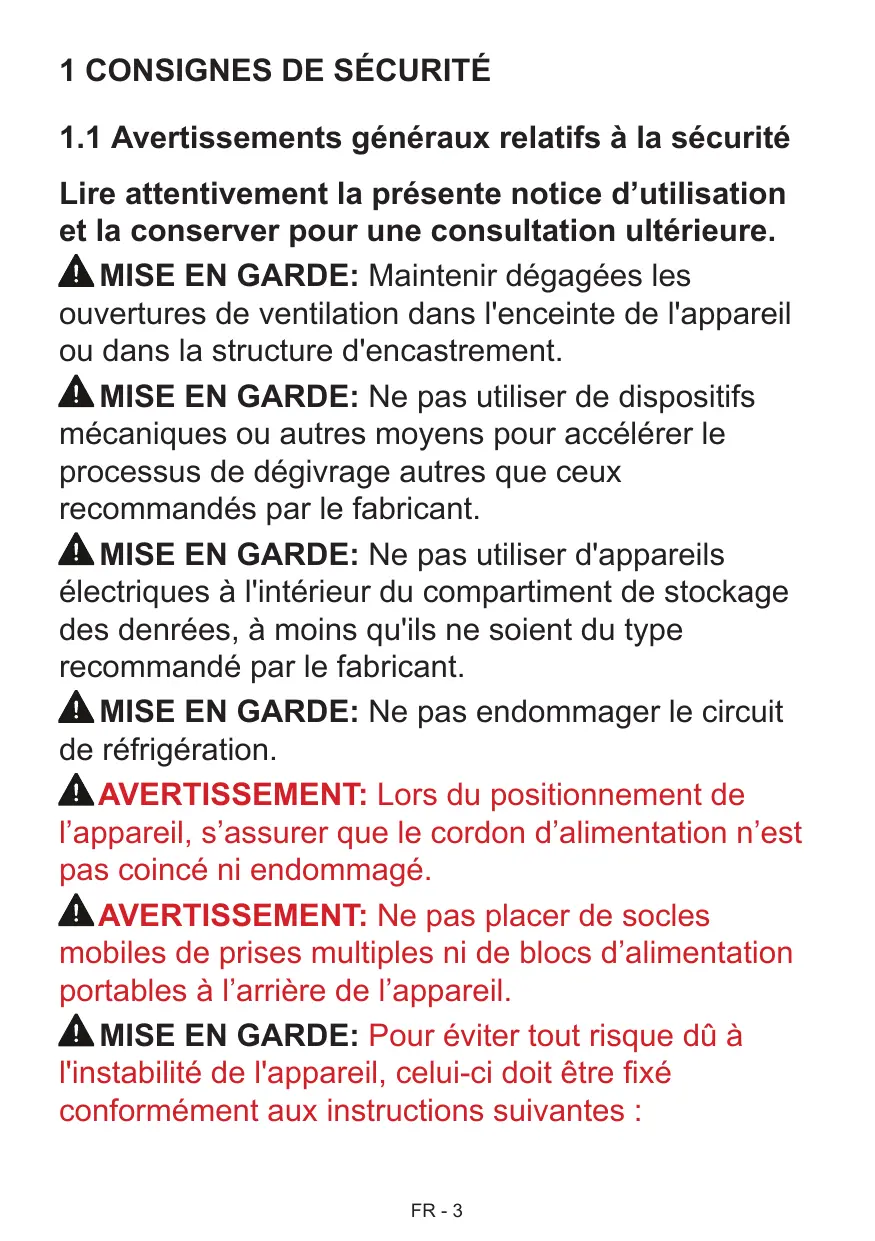 1.1 Avertissements généraux relatifs à la sécurité Lire attentivement la présente notice d’utilisation et la conserver pour une consultation ultérieure. MISE EN GARDE: Maintenir dégagées les ouvertures de ventilation dans l'enceinte de l'appareil ou dans la structure d'encastrement. MISE EN GARDE: Ne pas utiliser de dispositifs mécaniques ou autres moyens pour accélérer le processus de dégivrage autres que ceux recommandés par le fabricant. MISE EN GARDE: Ne pas utiliser d'appareils électriques à l'intérieur du compartiment de stockage des denrées, à moins qu'ils ne soient du type recommandé par le fabricant. MISE EN GARDE: Ne pas endommager le circuit de réfrigération. AVERTISSEMENT: Lors du positionnement de l’appareil, s’assurer que le cordon d’alimentation n’est pas coincé ni endommagé. AVERTISSEMENT: Ne pas placer de socles mobiles de prises multiples ni de blocs d’alimentation portables à l’arrière de l’appareil. MISE EN GARDE: Pour éviter tout risque dû à l'instabilité de l'appareil, celui-ci doit être fixé conformément aux instructions suivantes : FR - 3