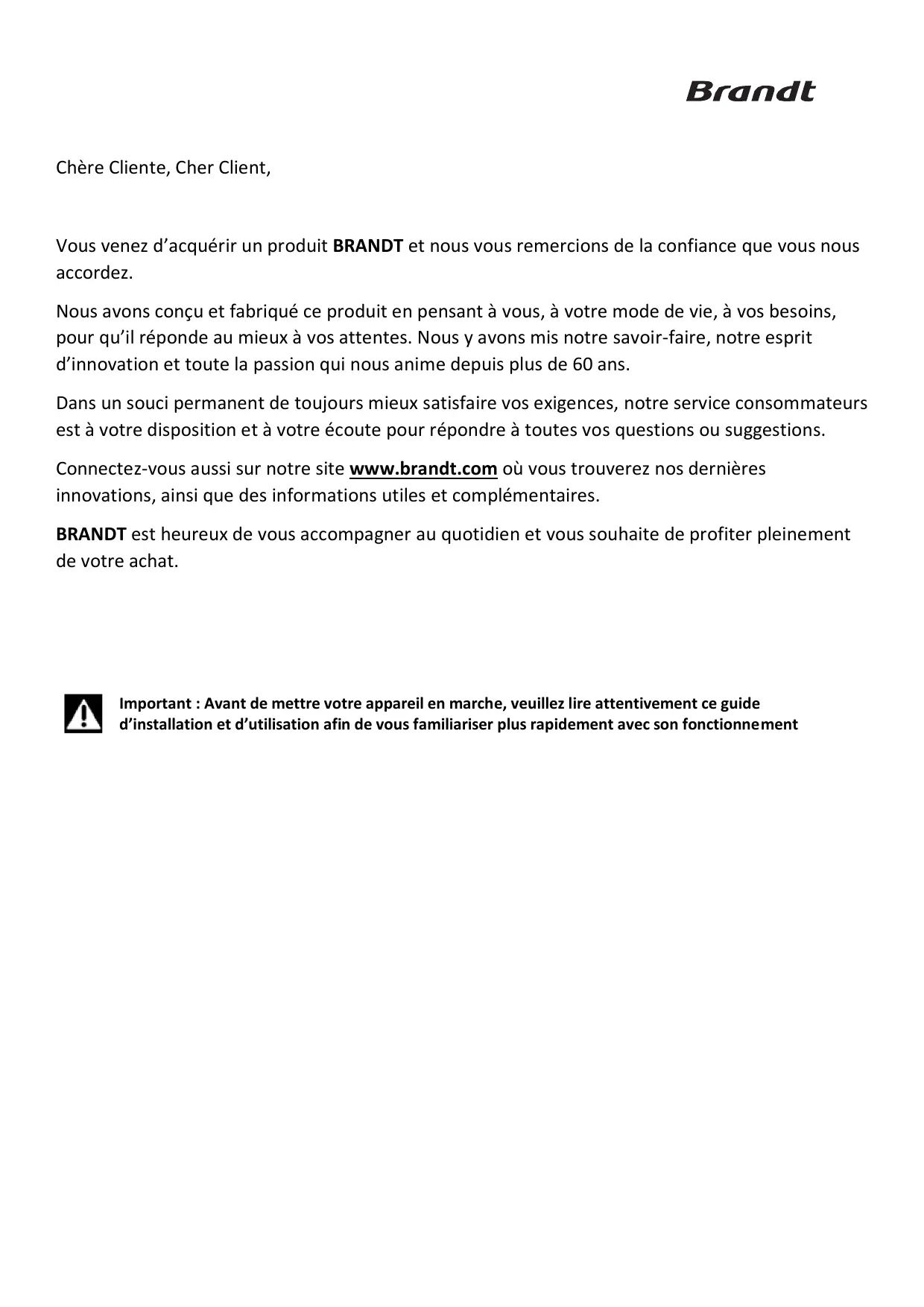 Nous avons conçu et fabriqué ce produit en pensant à vous, à votre mode de vie, à vos besoins, pour qu’il réponde au mieux à vos attentes. Nous y avons mis notre savoir-faire, notre esprit d’innovation et toute la passion qui nous anime depuis plus de 60 ans. Dans un souci permanent de toujours mieux satisfaire vos exigences, notre service consommateurs est à votre disposition et à votre écoute pour répondre à toutes vos questions ou suggestions. Connectez-vous aussi sur notre site www.brandt.com où vous trouverez nos dernières innovations, ainsi que des informations utiles et complémentaires. BRANDT est heureux de vous accompagner au quotidien et vous souhaite de profiter pleinement de votre achat.