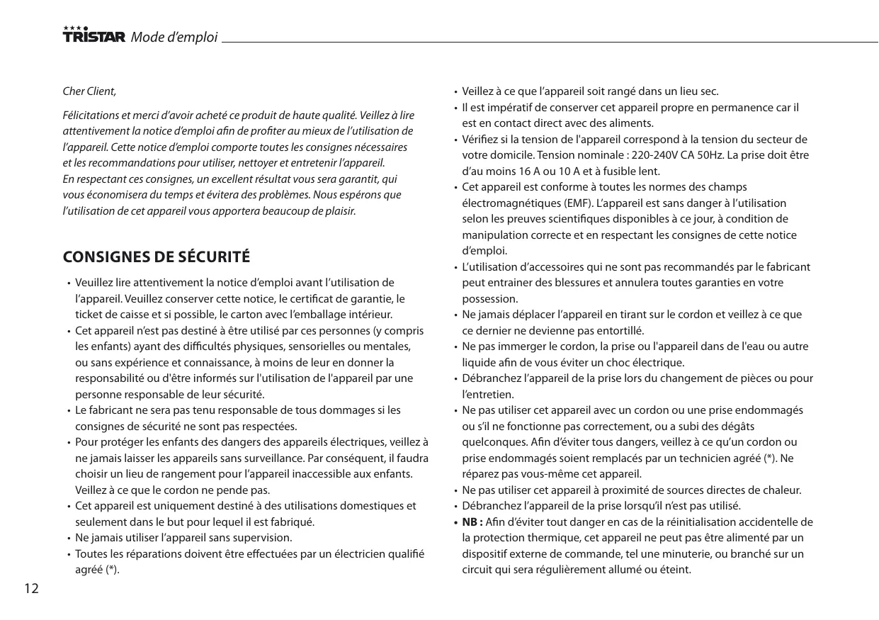 - Les dommages causés par le non respect de la notice d’emploi, entraineront l’annulation de la garantie, Tristar ne sera pas tenu responsable si des dégâts en résultent.