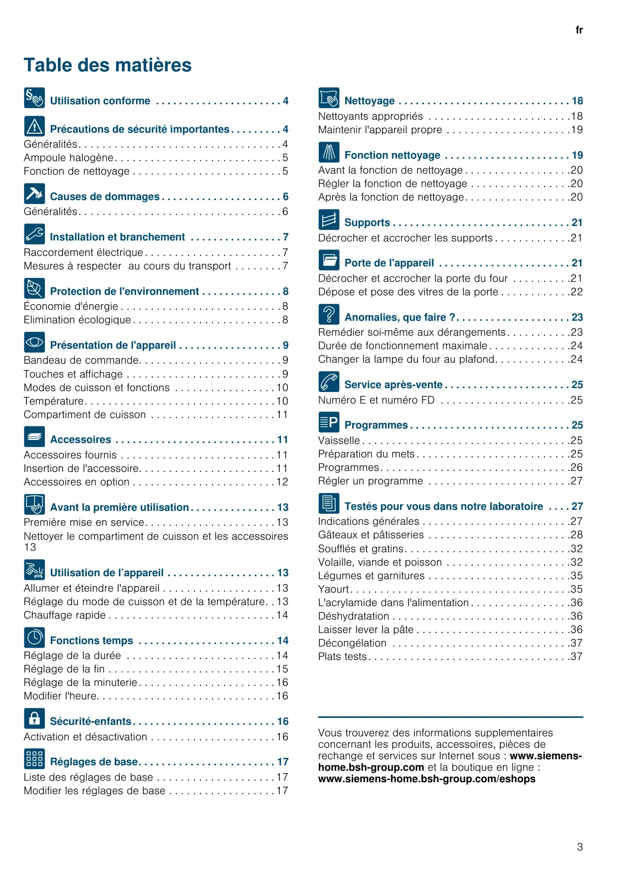 Produktinfo Vous trouverez des informations supplementaires concernant les produits, accessoires, pièces de rechange et services sur Internet sous : www.siemenshome.bsh-group.com et la boutique en ligne : www.siemens-home.bsh-group.com/eshops