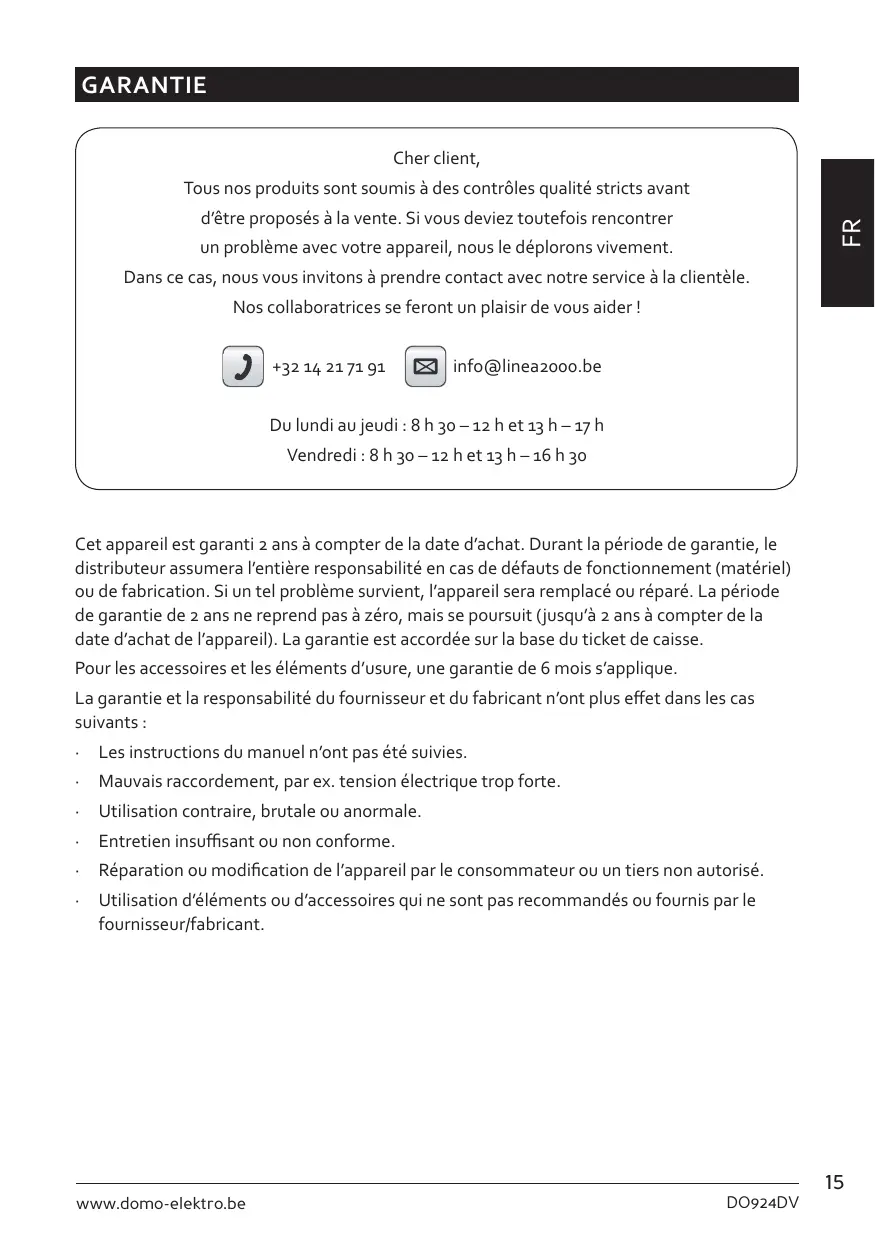 d’être proposés à la vente. Si vous deviez toutefois rencontrer un problème avec votre appareil, nous le déplorons vivement. Dans ce cas, nous vous invitons à prendre contact avec notre service à la clientèle. Nos collaboratrices se feront un plaisir de vous aider ! +32 14 21 71 91 info@linea2000.be Du lundi au jeudi : 8 h 30 – 12 h et 13 h – 17 h Vendredi : 8 h 30 – 12 h et 13 h – 16 h 30 Cet appareil est garanti 2 ans à compter de la date d’achat. Durant la période de garantie, le distributeur assumera l’entière responsabilité en cas de défauts de fonctionnement (matériel) ou de fabrication. Si un tel problème survient, l’appareil sera remplacé ou réparé. La période de garantie de 2 ans ne reprend pas à zéro, mais se poursuit (jusqu’à 2 ans à compter de la date d’achat de l’appareil). La garantie est accordée sur la base du ticket de caisse. Pour les accessoires et les éléments d’usure, une garantie de 6 mois s’applique. La garantie et la responsabilité du fournisseur et du fabricant n’ont plus effet dans les cas suivants :