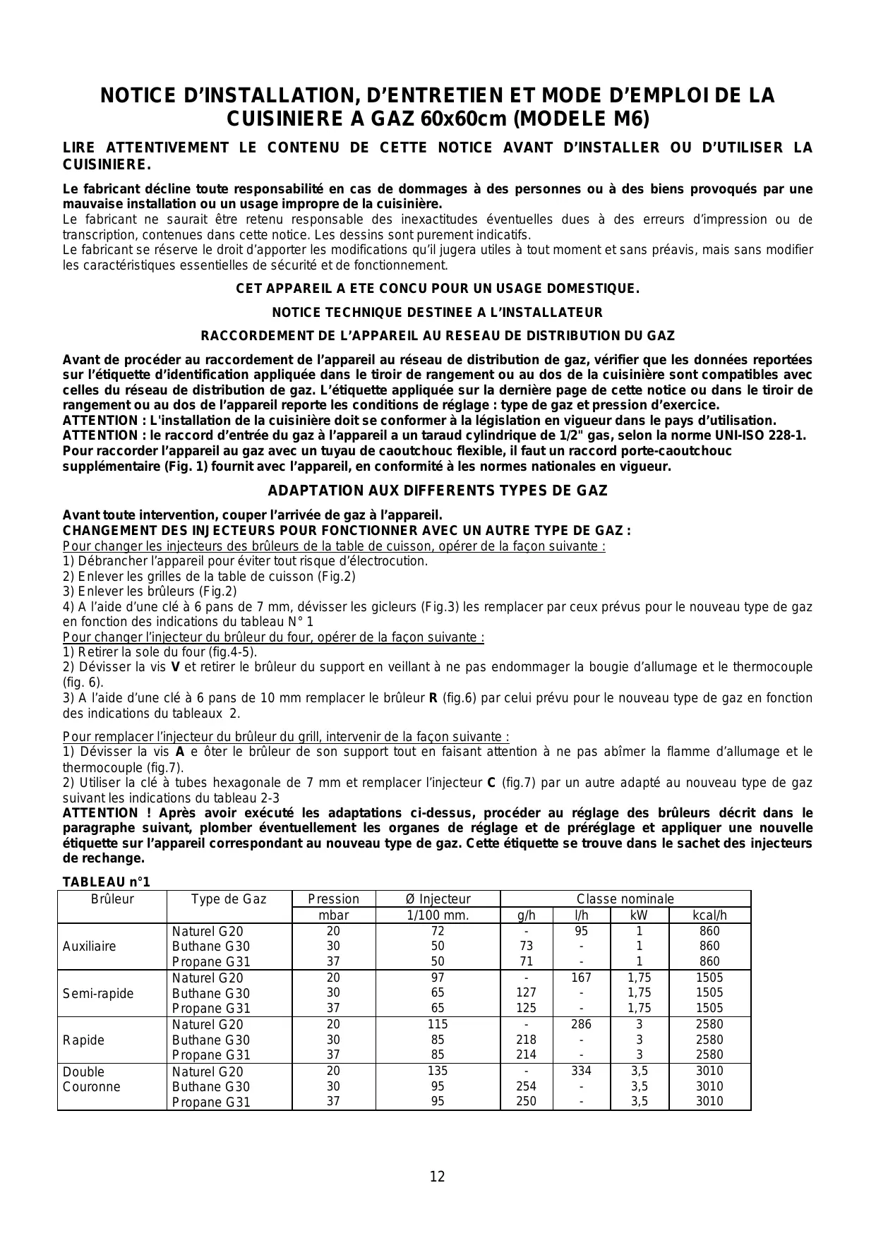 NOTICE D’INSTALLATION, D’ENTRETIEN ET MODE D’EMPLOI DE LA CUISINIERE A GAZ 60x60cm (MODELE M6) LIRE ATTENTIVEMENT LE CONTENU DE CETTE NOTICE AVANT D’INSTALLER OU D’UTILISER LA CUISINIERE. Le fabricant décline toute responsabilité en cas de dommages à des personnes ou à des biens provoqués par une mauvaise installation ou un usage impropre de la cuisinière. Le fabricant ne saurait être retenu responsable des inexactitudes éventuelles dues à des erreurs d’impression ou de transcription, contenues dans cette notice. Les dessins sont purement indicatifs. Le fabricant se réserve le droit d’apporter les modifications qu’il jugera utiles à tout moment et sans préavis, mais sans modifier les caractéristiques essentielles de sécurité et de fonctionnement. CET APPAREIL A ETE CONCU POUR UN USAGE DOMESTIQUE.