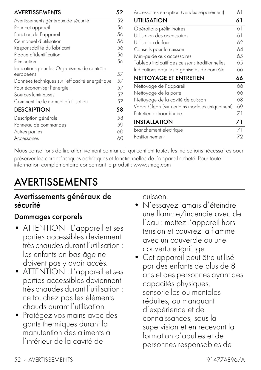 Nous conseillons de lire attentivement ce manuel qui contient toutes les indications nécessaires pour préserver les caractéristiques esthétiques et fonctionnelles de l’appareil acheté. Pour toute information complémentaire concernant le produit : www.smeg.com AVERTISSEMENTS Avertissements généraux de sécurité Dommages corporels