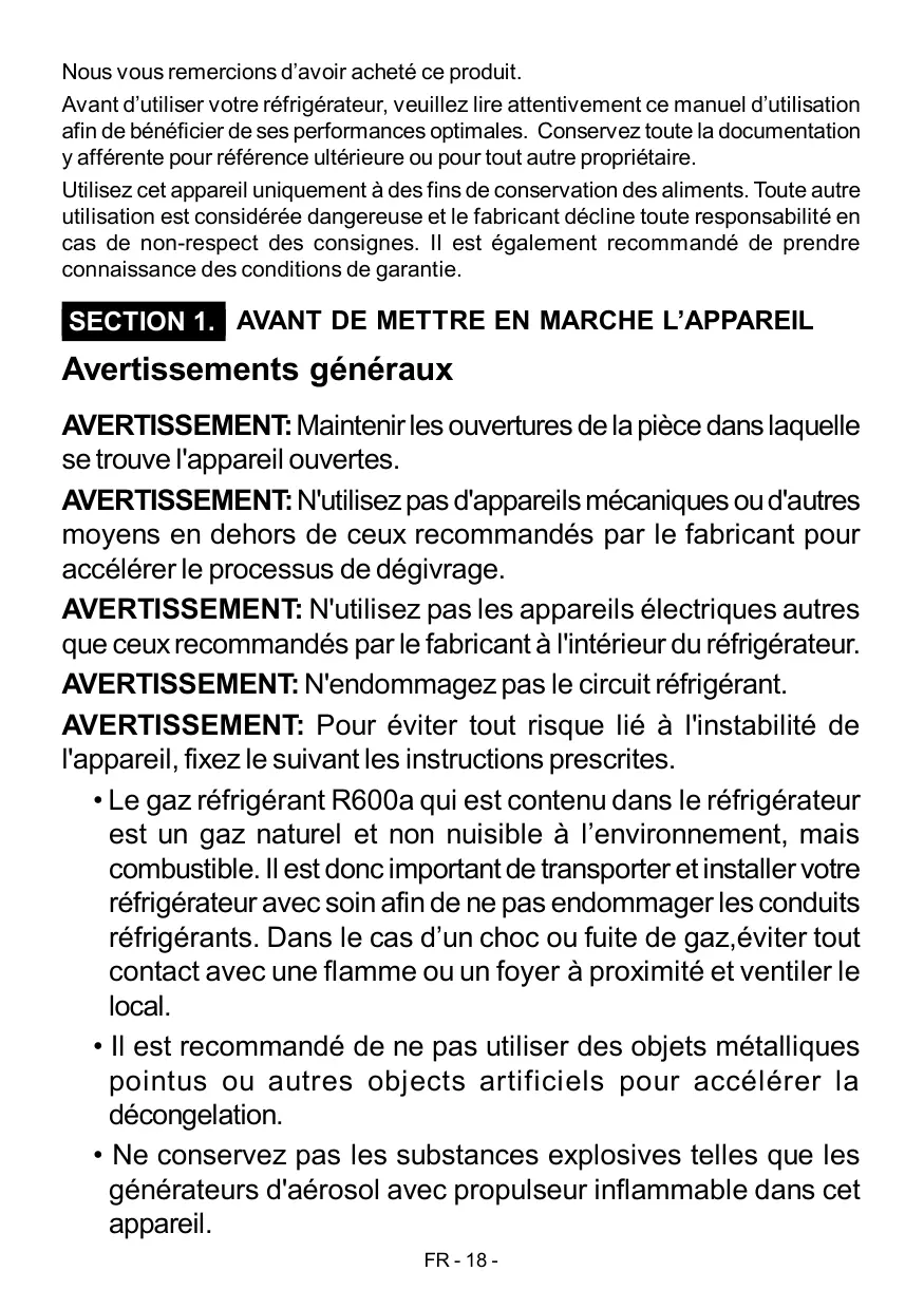 FR - 17 - Nous vous remercions d’avoir acheté ce produit. Avant d’utiliser votre réfrigérateur, veuillez lire attentivement ce manuel d’utilisation afin de bénéficier de ses performances optimales. Conservez toute la documentation y afférente pour référence ultérieure ou pour tout autre propriétaire. Utilisez cet appareil uniquement à des fins de conservation des aliments. Toute autre utilisation est considérée dangereuse et le fabricant décline toute responsabilité en cas de non-respect des consignes. Il est également recommandé de prendre connaissance des conditions de garantie.