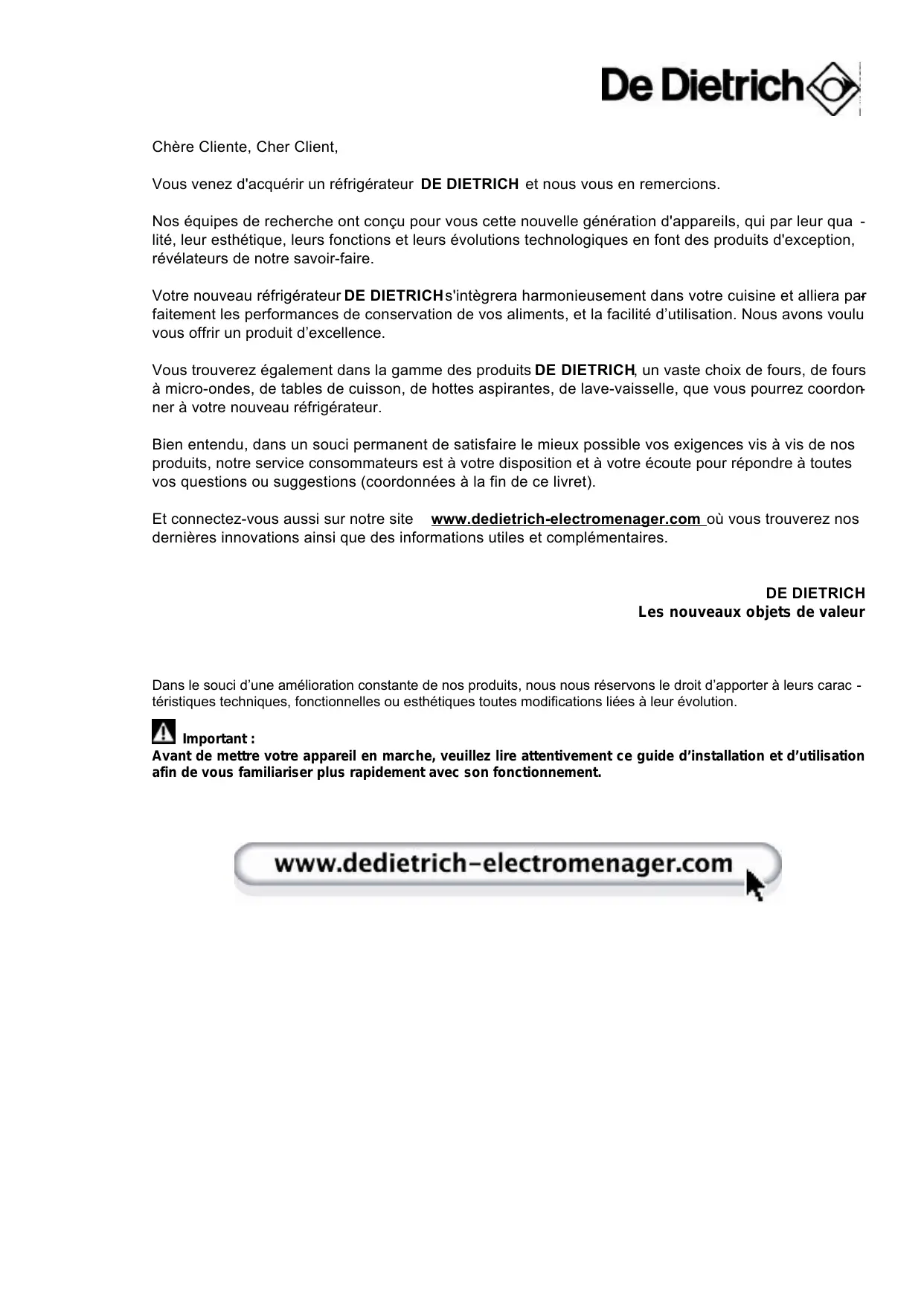 Chère Cliente, Cher Client, Vous venez d'acquérir un réfrigérateur DE DIETRICH et nous vous en remercions. Nos équipes de recherche ont conçu pour vous cette nouvelle génération d'appareils, qui par leur qua lité, leur esthétique, leurs fonctions et leurs évolutions technologiques en font des produits d'exception, révélateurs de notre savoir-faire. Votre nouveau réfrigérateur DE DIETRICH s'intègrera harmonieusement dans votre cuisine et alliera parfaitement les performances de conservation de vos aliments, et la facilité d’utilisation. Nous avons voulu vous offrir un produit d’excellence. Vous trouverez également dans la gamme des produits DE DIETRICH, un vaste choix de fours, de fours à micro-ondes, de tables de cuisson, de hottes aspirantes, de lave-vaisselle, que vous pourrez coordonner à votre nouveau réfrigérateur. Bien entendu, dans un souci permanent de satisfaire le mieux possible vos exigences vis à vis de nos produits, notre service consommateurs est à votre disposition et à votre écoute pour répondre à toutes vos questions ou suggestions (coordonnées à la fin de ce livret). Et connectez-vous aussi sur notre site www.dedietrich-electromenager.com où vous trouverez nos dernières innovations ainsi que des informations utiles et complémentaires. DE DIETRICH Les nouveaux objets de valeur Dans le souci d’une amélioration constante de nos produits, nous nous réservons le droit d’apporter à leurs carac téristiques techniques, fonctionnelles ou esthétiques toutes modifications liées à leur évolution. Important : Avant de mettre votre appareil en marche, veuillez lire attentivement ce guide d’installation et d’utilisation afin de vous familiariser plus rapidement avec son fonctionnement.