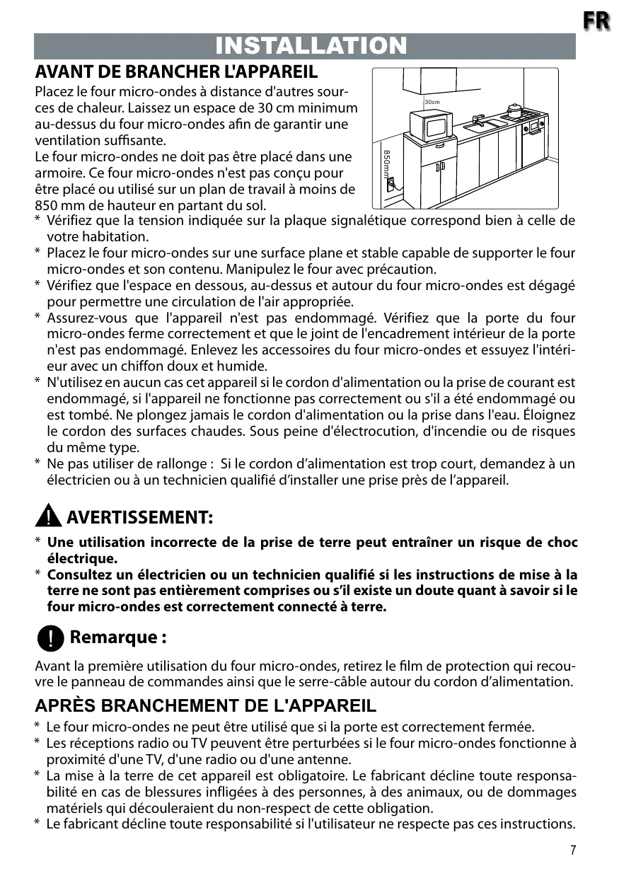 être placé ou utilisé sur un plan de travail à moins de 850 mm de hauteur en partant du sol. * Vérifiez que la tension indiquée sur la plaque signalétique correspond bien à celle de votre habitation. * Placez le four micro-ondes sur une surface plane et stable capable de supporter le four micro-ondes et son contenu. Manipulez le four avec précaution. * Vérifiez que l'espace en dessous, au-dessus et autour du four micro-ondes est dégagé pour permettre une circulation de l'air appropriée. * Assurez-vous que l'appareil n'est pas endommagé. Vérifiez que la porte du four micro-ondes ferme correctement et que le joint de l'encadrement intérieur de la porte n'est pas endommagé. Enlevez les accessoires du four micro-ondes et essuyez l'intérieur avec un chiffon doux et humide. * N'utilisez en aucun cas cet appareil si le cordon d'alimentation ou la prise de courant est endommagé, si l'appareil ne fonctionne pas correctement ou s'il a été endommagé ou est tombé. Ne plongez jamais le cordon d'alimentation ou la prise dans l'eau. Éloignez le cordon des surfaces chaudes. Sous peine d'électrocution, d'incendie ou de risques du même type. * Ne pas utiliser de rallonge : Si le cordon d’alimentation est trop court, demandez à un électricien ou à un technicien qualifié d’installer une prise près de l’appareil. 30cm