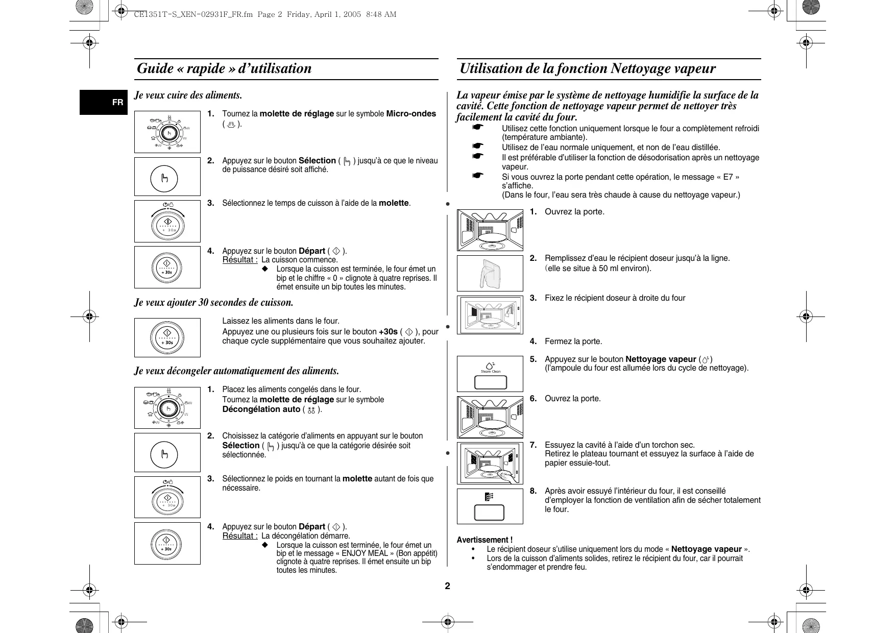 Guide « rapide » d’utilisation Utilisation de la fonction Nettoyage vapeur Je veux cuire des aliments. La vapeur émise par le système de nettoyage humidifie la surface de la cavité. Cette fonction de nettoyage vapeur permet de nettoyer très facilement la cavité du four.