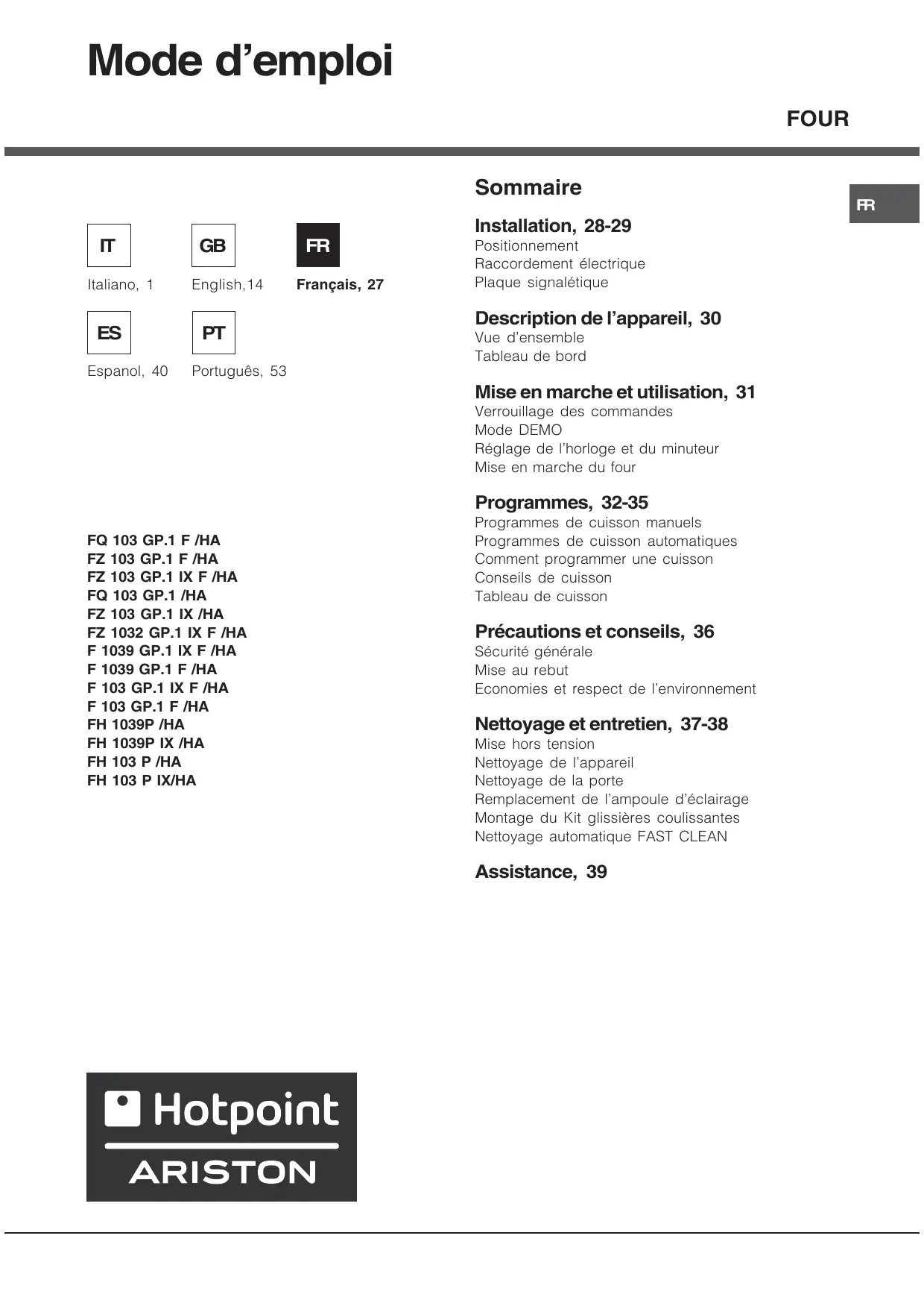 Retrouvez gratuitement la notice de l'appareil FH 103 P IX HA S HOTPOINT au format PDF.