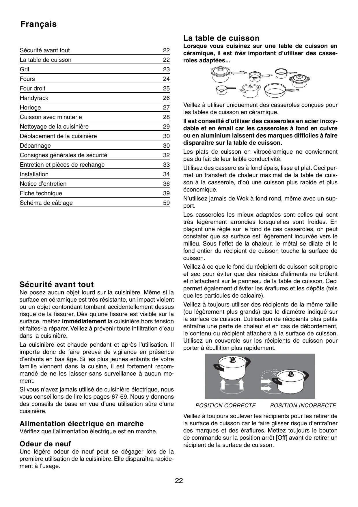 Ne posez aucun objet lourd sur la cuisinière. Même si la surface en céramique est très résistante, un impact violent ou un objet contondant tombant accidentellement dessus risque de la fissurer. Dès qu’une fissure est visible sur la surface, mettez immédiatement la cuisinière hors tension et faites-la réparer. Veillez à prévenir toute infiltration d’eau dans la cuisinière. La cuisinière est chaude pendant et après l’utilisation. Il importe donc de faire preuve de vigilance en présence d’enfants en bas âge. Si les plus jeunes enfants de votre famille viennent dans la cuisine, il est fortement recommandé de ne les laisser sans surveillance à aucun moment. Si vous n’avez jamais utilisé de cuisinière électrique, nous vous conseillons de lire les pages 67-69. Nous y donnons des conseils de base en vue d’une utilisation sûre d’une cuisinière.