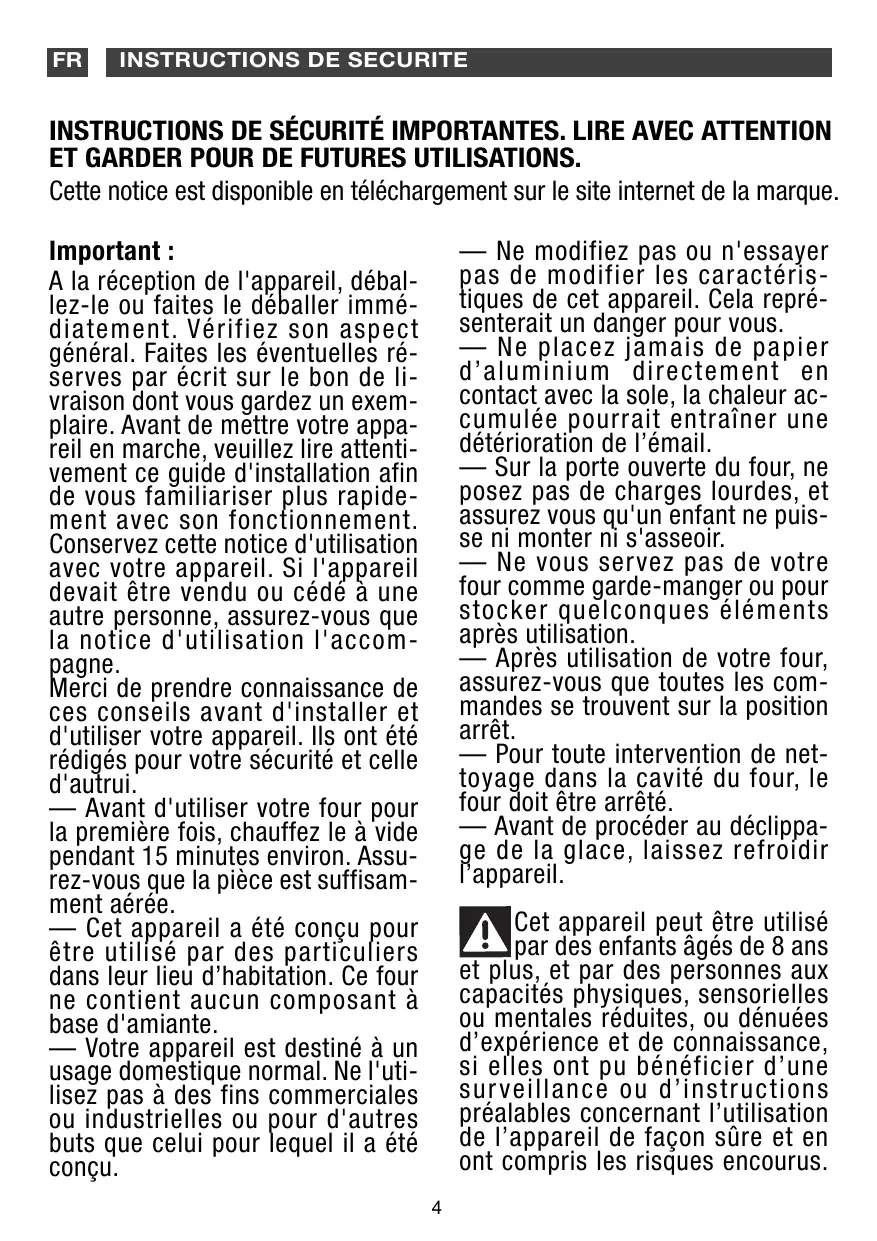 INSTRUCTIONS DE SÉCURITÉ IMPORTANTES. LIRE AVEC ATTENTION ET GARDER POUR DE FUTURES UTILISATIONS. Cette notice est disponible en téléchargement sur le site internet de la marque. — Ne modifiez pas ou n'essayer pas de modifier les caractéristiques de cet appareil. Cela représenterait un danger pour vous. — Ne placez jamais de pa pier d’aluminium directement en contact avec la sole, la chaleur accumulée pourrait entraîner une détérioration de l’émail. — Sur la porte ouverte du four, ne posez pas de charges lourdes, et assurez vous qu'un enfant ne puisse ni monter ni s'asseoir. — Ne vous servez pas de votre four comme garde-manger ou pour stocker quelconques éléments après utilisation. — Après utilisation de votre four, assurez-vous que toutes les commandes se trouvent sur la position arrêt. — Pour toute intervention de nettoyage dans la cavité du four, le four doit être arrêté. — Avant de procéder au déclippage de la glace, laissez refroidir l’appareil. Important : A la réception de l'appareil, déballez-le ou faites le déballer immédiatement. Vérifiez son aspect général. Faites les éventuelles réserves par écrit sur le bon de livraison dont vous gardez un exemplaire. Avant de mettre votre appareil en marche, veuillez lire attentivement ce guide d'installation afin de vous familiariser plus rapidement avec son fonctionnement. Conservez cette notice d'utilisation avec votre appareil. Si l'appareil devait être vendu ou cédé à une autre personne, assurez-vous que la notice d'utilisation l'accompagne. Merci de prendre connaissance de ces conseils avant d'installer et d'utiliser votre appareil. Ils ont été rédigés pour votre sécurité et celle d'autrui. — Avant d'utiliser votre four pour la première fois, chauffez le à vide pendant 15 minutes environ. Assurez-vous que la pièce est suffisamment aérée. — Cet appareil a été conçu pour être utilisé par des particuliers dans leur lieu d’habitation. Ce four ne contient aucun composant à base d'amiante. — Votre appareil est destiné à un usage domestique normal. Ne l'utilisez pas à des fins commerciales ou industrielles ou pour d'autres buts que celui pour lequel il a été conçu. Cet appareil peut être utilisé par des enfants âgés de 8 ans et plus, et par des personnes aux capacités physiques, sensorielles ou mentales réduites, ou dénuées d’expérience et de connaissance, si elles ont pu bénéficier d’une sur veillance ou d’instructions préalables concernant l’utilisation de l’appareil de façon sûre et en ont compris les risques encourus.