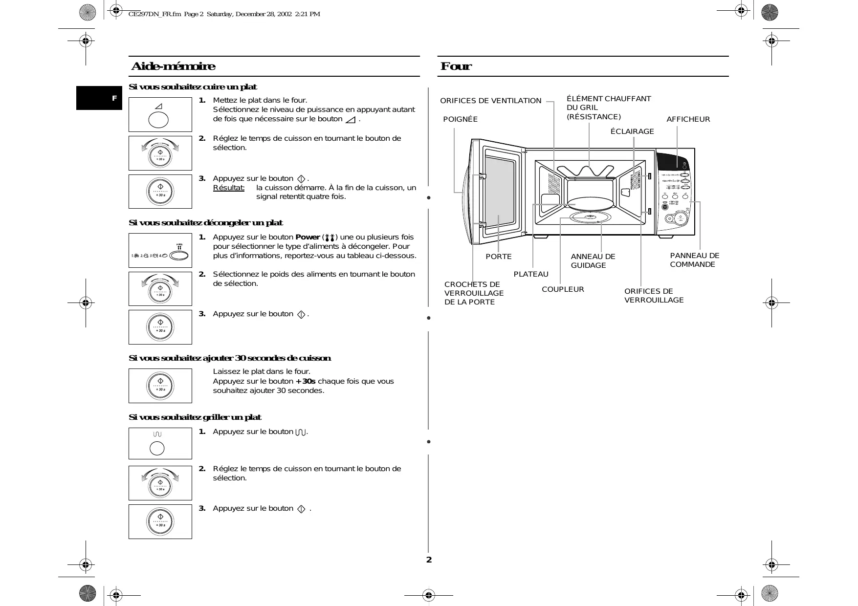 CE297DN_FR.fm Page 15 Saturday, December 28, 2002 2:21 PM Verrouillez votre four à micro-ondes Désactivez la rotation du plateau Votre four à micro-ondes est doté d’un programme de sécurité vous permettant de verrouiller le four, de telle sorte qu’un enfant ou une personne ne connaissant pas son fonctionnement ne puisse pas l’actionner par mégarde. Le four peut être verrouillé à tout moment. Le bouton de désactivation de la rotation du plateau ( ) empêche le plateau de tourner et vous permet ainsi de cuire, réchauffer ou décongeler des aliments dans des plats de grande taille occupant toute la cavité du four.