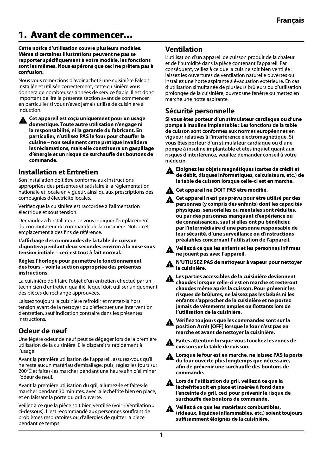 Nous vous remercions d'avoir acheté une cuisinière Falcon. Installée et utilisée correctement, cette cuisinière vous donnera de nombreuses années de service fiable. Il est donc important de lire la présente section avant de commencer, en particulier si vous n'avez jamais utilisé de cuisinière à induction.
