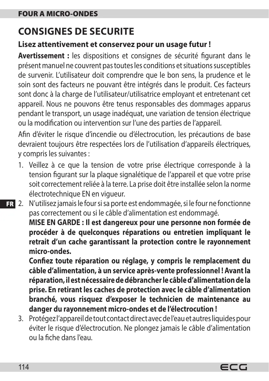 Toute intervention ou réparation sur le four à micro-ondes doit être effectuee exclusivement par un technicien qualifie.
