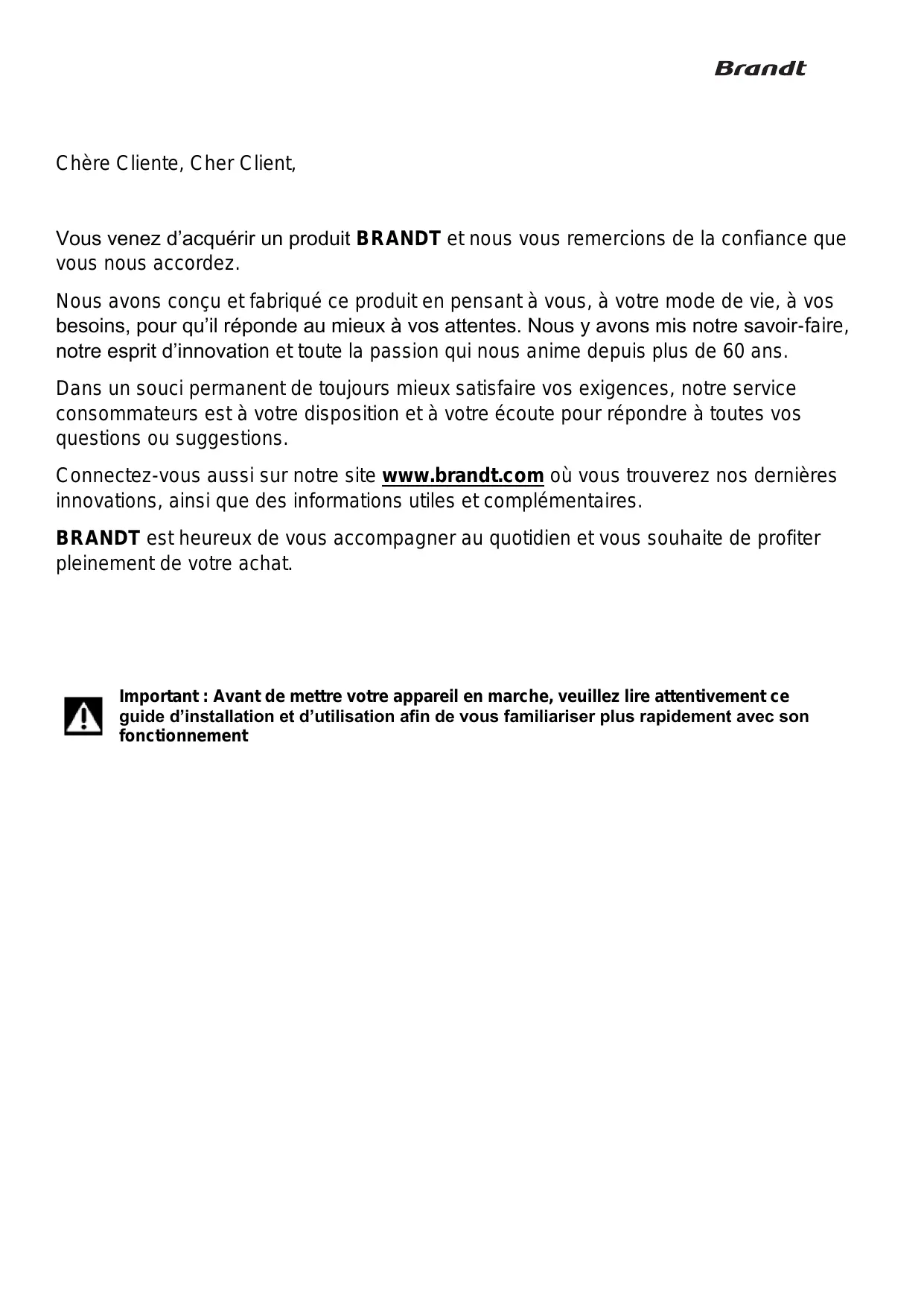 Nous appeler du lundi au vendredi de 8h30 à 18h00 au : Interventions France Les éventuelles interventions sur votre appareil doivent être effectuées par un professionnel qualifié dépositaire de la marque. Lors de votre appel, mentionnez la référence complète de votre appareil (modèle, type, numéro de série). Ces renseignements figurent sur la plaque signalétique située en bas à gauche du réfrigérateur (au-dessus de la clayette ou derrière le bac à légumes). Référence Numéro de série Type Modèle Référence Service Vous pouvez nous contacter du lundi au samedi de 8h00 à 20h00 au : Vous pouvez trouver une liste de réparateurs agréés sur notre site www.brandt.com Ce site web donne également accès aux informations concernant les pièces de rechange. Pièces d’origine Lors d’une intervention d’entretien, demandez l’utilisation exclusive de pièces détachées certifiées d’origine. La durée minimale de mise à disposition des pièces de rechange inscrites dans la liste du Règlement Européen 2019-2019-EU et accessibles notamment à l'utilisateur de l'appareil, est de 10 ans dans les conditions prévues par ce même règlement. Garantie Veuillez-vous rapprocher de votre revendeur pour bénéficier de la garantie. Le fabricant n’offre pas de garantie commerciale de l’appareil de réfrigération. Dear Customer, You have just purchased a BRANDT product and we thank you for your trust. We designed and manufactured this product with you, your lifestyle and your needs in mind, in order to best meet your expectations. We have put into it our expertise, our spirit of innovation and all the passion which has driven us for over 60 years. We make every effort to ensure our products better meet your requirements, and our Customer Relations Department is at your disposal and will be happy to hear any questions or suggestions you may have. You may also visit our website www.brandt.com where you will find our latest innovations, as well as useful and complementary information. BRANDT is happy to assist you in your daily life and hopes you will fully enjoy your purchase. Important: Before switching on your appliance, please read this user guide carefully in order to familiarise yourself more quickly with its operation. SAFETY This appliance complies with the European directives. SAFETY GUIDELINES For your safety and in order to use your appliance correctly, carefully read these instructions (including the warnings and useful advice), before installation and first use. To avoid damaging the appliance and unnecessary injury, it is important that the persons who use the appliance fully understand how it works and the safety instructions. Always keep these instructions close to the appliance so that they can accompany it in the event of resale or a change of house. In this way, the appliance will continue to function optimally and any risk of injury will be avoided. The manufacturer shall not be held liable in the event of misuse of the appliance.