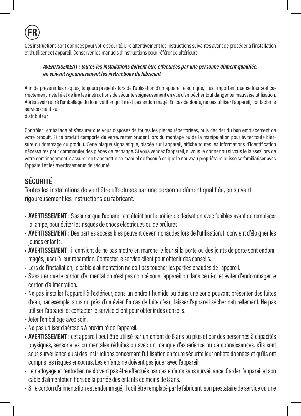 en suivant rigoureusement les instructions du fabricant. Afin de prévenir les risques, toujours présents lors de l’utilisation d’un appareil électrique, il est important que ce four soit correctement installé et de lire les instructions de sécurité soigneusement en vue d’empêcher tout danger ou mauvaise utilisation. Après avoir retiré l’emballage du four, vérifier qu’il n’est pas endommagé. En cas de doute, ne pas utiliser l’appareil, contacter le service client au distributeur. Contrôler l’emballage et s’assurer que vous disposez de toutes les pièces répertoriées, puis décider du bon emplacement de votre produit. Si ce produit comporte du verre, rester prudent lors du montage ou de la manipulation pour éviter toute blessure ou dommage du produit. Cette plaque signalétique, placée sur l’appareil, affiche toutes les informations d’identification nécessaires pour commander des pièces de rechange. Si vous vendez l’appareil, si vous le donnez ou si vous le laissez lors de votre déménagement, s’assurer de transmettre ce manuel de façon à ce que le nouveau propriétaire puisse se familiariser avec l’appareil et les avertissements de sécurité. SÉCURITÉ Toutes les installations doivent être effectuées par une personne dûment qualifiée, en suivant rigoureusement les instructions du fabricant.