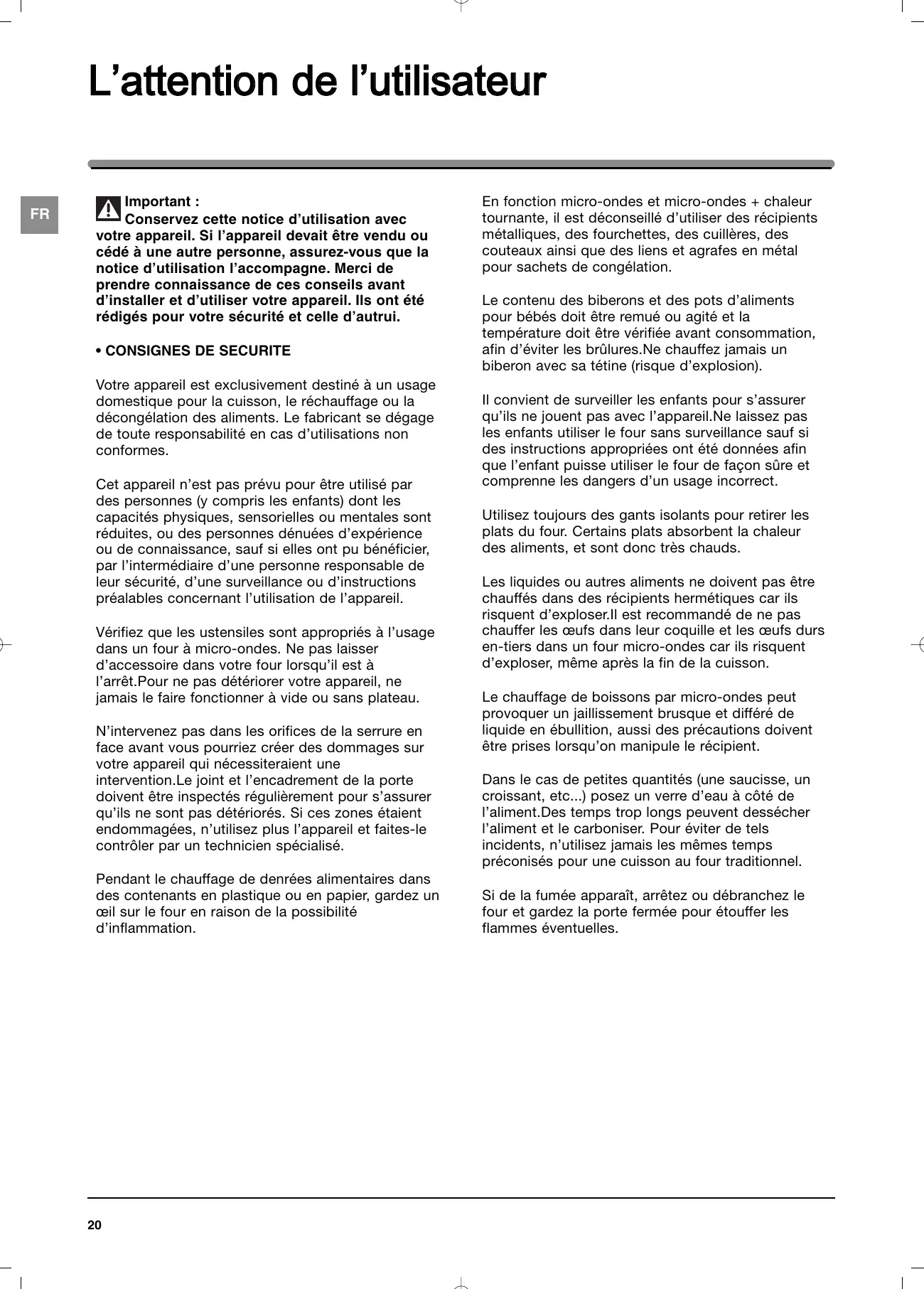 En fonction micro-ondes et micro-ondes + chaleur tournante, il est déconseillé d’utiliser des récipients métalliques, des fourchettes, des cuillères, des couteaux ainsi que des liens et agrafes en métal pour sachets de congélation. Le contenu des biberons et des pots d’aliments pour bébés doit être remué ou agité et la température doit être vérifiée avant consommation, afin d’éviter les brûlures.Ne chauffez jamais un biberon avec sa tétine (risque d’explosion). Il convient de surveiller les enfants pour s’assurer qu’ils ne jouent pas avec l’appareil.Ne laissez pas les enfants utiliser le four sans surveillance sauf si des instructions appropriées ont été données afin que l’enfant puisse utiliser le four de façon sûre et comprenne les dangers d’un usage incorrect. Utilisez toujours des gants isolants pour retirer les plats du four. Certains plats absorbent la chaleur des aliments, et sont donc très chauds. Les liquides ou autres aliments ne doivent pas être chauffés dans des récipients hermétiques car ils risquent d’exploser.Il est recommandé de ne pas chauffer les œufs dans leur coquille et les œufs durs en-tiers dans un four micro-ondes car ils risquent d’exploser, même après la fin de la cuisson. Le chauffage de boissons par micro-ondes peut provoquer un jaillissement brusque et différé de liquide en ébullition, aussi des précautions doivent être prises lorsqu’on manipule le récipient. Dans le cas de petites quantités (une saucisse, un croissant, etc...) posez un verre d’eau à côté de l’aliment.Des temps trop longs peuvent dessécher l’aliment et le carboniser. Pour éviter de tels incidents, n’utilisez jamais les mêmes temps préconisés pour une cuisson au four traditionnel. Si de la fumée apparaît, arrêtez ou débranchez le four et gardez la porte fermée pour étouffer les flammes éventuelles. L’attention de l’utilisateur
