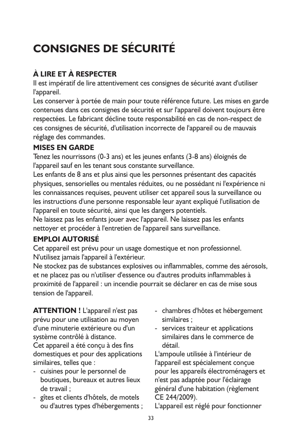 Les conserver à portée de main pour toute référence future. Les mises en garde contenues dans ces consignes de sécurité et sur l'appareil doivent toujours être respectées. Le fabricant décline toute responsabilité en cas de non-respect de ces consignes de sécurité, d'utilisation incorrecte de l'appareil ou de mauvais réglage des commandes. MISES EN GARDE Tenez les nourrissons (0-3 ans) et les jeunes enfants (3-8 ans) éloignés de l'appareil sauf en les tenant sous constante surveillance. Les enfants de 8 ans et plus ainsi que les personnes présentant des capacités physiques, sensorielles ou mentales réduites, ou ne possédant ni l'expérience ni les connaissances requises, peuvent utiliser cet appareil sous la surveillance ou les instructions d'une personne responsable leur ayant expliqué l'utilisation de l'appareil en toute sécurité, ainsi que les dangers potentiels. Ne laissez pas les enfants jouer avec l'appareil. Ne laissez pas les enfants nettoyer et procéder à l'entretien de l'appareil sans surveillance. EMPLOI AUTORISÉ Cet appareil est prévu pour un usage domestique et non professionnel. N'utilisez jamais l'appareil à l'extérieur. Ne stockez pas de substances explosives ou inflammables, comme des aérosols, et ne placez pas ou n'utiliser d'essence ou d'autres produits inflammables à proximité de l'appareil : un incendie pourrait se déclarer en cas de mise sous tension de l'appareil. ATTENTION ! L'appareil n'est pas prévu pour une utilisation au moyen d'une minuterie extérieure ou d'un système contrôlé à distance. Cet appareil a été conçu à des fins domestiques et pour des applications similaires, telles que : - cuisines pour le personnel de boutiques, bureaux et autres lieux de travail ; - gîtes et clients d'hôtels, de motels ou d'autres types d'hébergements ;