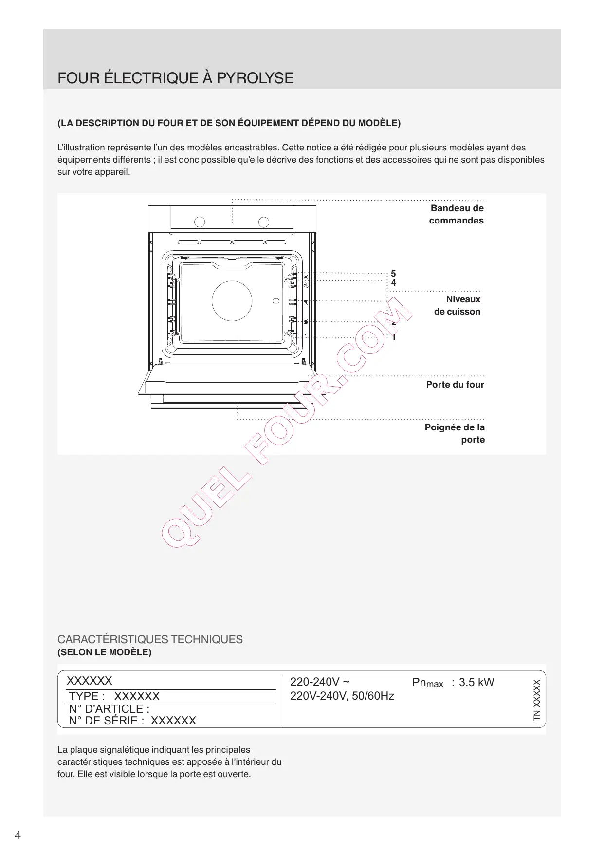 La plaque signalétique indiquant les principales caractéristiques techniques est apposée à l’intérieur du four. Elle est visible lorsque la porte est ouverte.