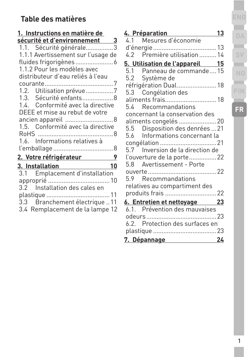 4. Préparation 13 4.1 Mesures d'économie d'énergie13 4.2 Première utilisation14 5. Utilisation de l'appareil 15 5.1 Panneau de commande15 5.2 Système de réfrigération Dual18 5.3 Congélation des aliments frais18 5.4 Recommandations concernant la conservation des aliments congelés20 5.5 Disposition des denrées....21 5.6 Informations concernant la congélation21 5.7 Inversion de la direction de l’ouverture de la porte22 5.8 Avertissement - Porte ouverte22 5.9 Recommandations relatives au compartiment des produits frais22 6. Entretien et nettoyage 23 6.1. Prévention des mauvaises odeurs23 6.2. Protection des surfaces en plastique23 7. Dépannage 24
