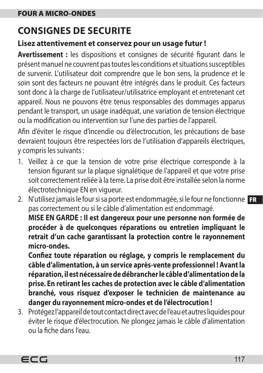 pourriez ainsi endommager le four. Ne couvrez pas et n’obstruez pas les ouvertures d’aération du four. 18. N’utilisez jamais d’accessoires non recommandés par le fabricant ; le nonrespect de cette consigne risque d’entraîner l’annulation de la garantie. FR 19. Utilisez le four à micro-ondes uniquement en respectant les instructions figurant dans le présent mode d’emploi. Ce four à micro-ondes est destiné à un usage exclusivement domestique. Le fabricant ne peut être tenu responsable de dommages causés par un usage incorrect de cet appareil.