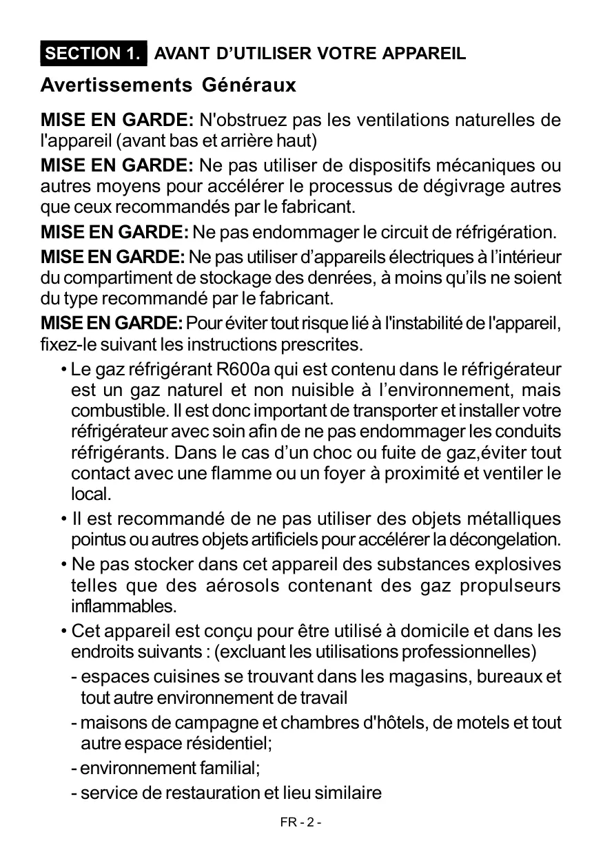 SECTION 1. AVANT D’UTILISER VOTRE APPAREIL Avertissements Généraux MISE EN GARDE: N'obstruez pas les ventilations naturelles de l'appareil (avant bas et arrière haut) MISE EN GARDE: Ne pas utiliser de dispositifs mécaniques ou autres moyens pour accélérer le processus de dégivrage autres que ceux recommandés par le fabricant. MISE EN GARDE: Ne pas endommager le circuit de réfrigération. MISE EN GARDE: Ne pas utiliser d’appareils électriques à l’intérieur du compartiment de stockage des denrées, à moins qu’ils ne soient du type recommandé par le fabricant. MISE EN GARDE: Pour éviter tout risque lié à l'instabilité de l'appareil, fixez-le suivant les instructions prescrites. • Le gaz réfrigérant R600a qui est contenu dans le réfrigérateur est un gaz naturel et non nuisible à l’environnement, mais combustible. Il est donc important de transporter et installer votre réfrigérateur avec soin afin de ne pas endommager les conduits réfrigérants. Dans le cas d’un choc ou fuite de gaz,éviter tout contact avec une flamme ou un foyer à proximité et ventiler le local. • Il est recommandé de ne pas utiliser des objets métalliques pointus ou autres objets artificiels pour accélérer la décongelation. • Ne pas stocker dans cet appareil des substances explosives telles que des aérosols contenant des gaz propulseurs inflammables. • Cet appareil est conçu pour être utilisé à domicile et dans les endroits suivants : (excluant les utilisations professionnelles) - espaces cuisines se trouvant dans les magasins, bureaux et tout autre environnement de travail - maisons de campagne et chambres d'hôtels, de motels et tout autre espace résidentiel; - environnement familial; - service de restauration et lieu similaire FR - 2 -