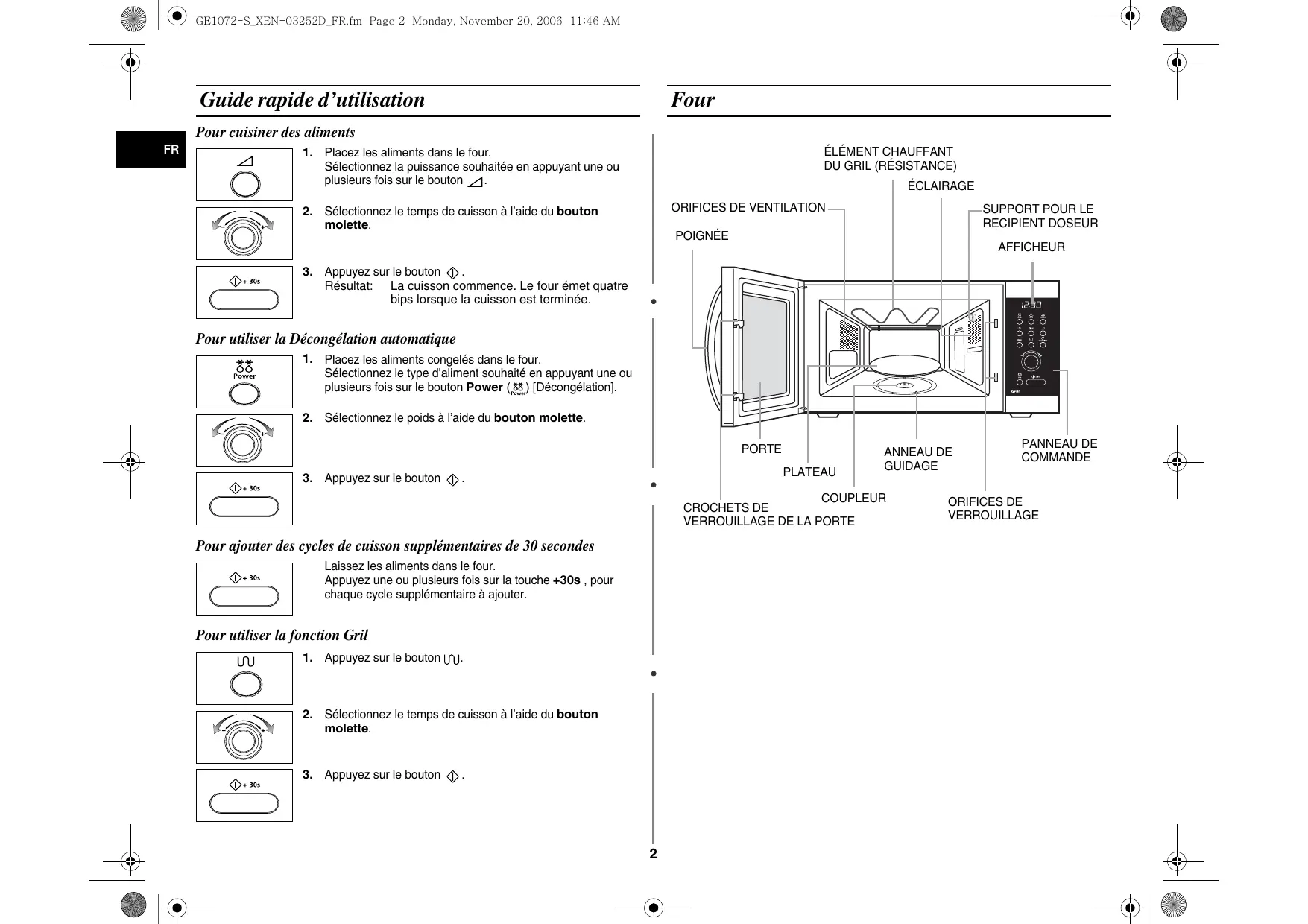 Pour ajouter des cycles de cuisson supplémentaires de 30 secondes Laissez les aliments dans le four. Appuyez une ou plusieurs fois sur la touche +30s , pour chaque cycle supplémentaire à ajouter. Pour utiliser la fonction Gril