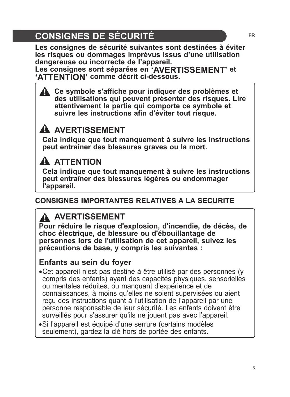 •Si l’appareil est équipé d’une serrure (certains modèles seulement), gardez la clé hors de portée des enfants.