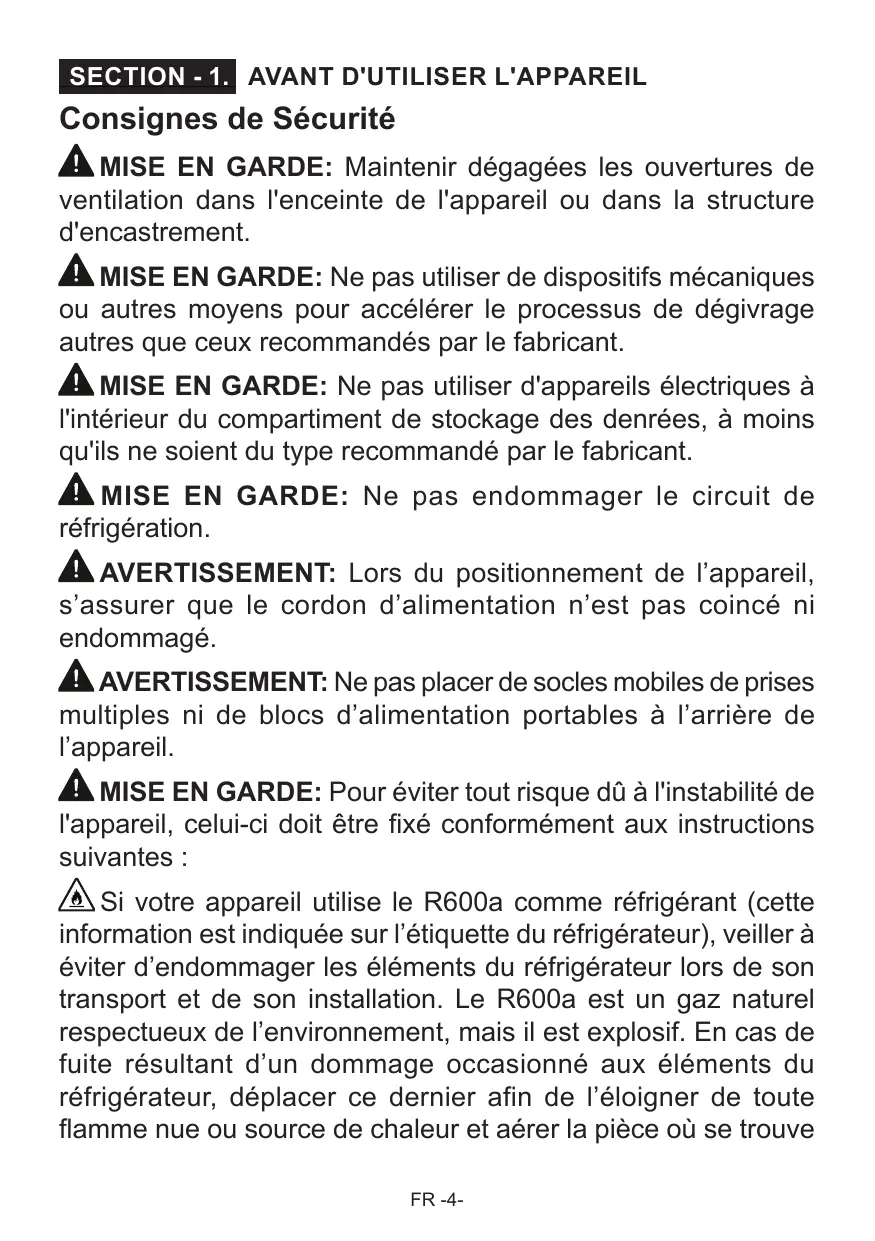EXGiCR EE AVANT D'UTILISER L'APPAREIL Consignes de Sécurité Â mise EN GARDE: Maintenir dégagées les ouvertures de ventilation dans l'enceinte de l'appareil ou dans la structure d'encastrement. À MISE EN GARDE: Ne pas utiliser de dispositifs mécaniques ou autres moyens pour accélérer le processus de dégivrage autres que ceux recommandés par le fabricant. Â mise EN GARDE: Ne pas utiliser d'appareils électriques à l'intérieur du compartiment de stockage des denrées, à moins qu'ils ne soient du type recommandé par le fabricant. Âmise EN GARDE: Ne pas endommager le circuit de réfrigération. À AVERTISSEMENT: Lors du positionnement de l'appareil, s'assurer que le cordon d'alimentation n’est pas coincé ni endommagé. À AVERTISSEMENT: Ne pas placer de socles mobiles de prises multiples ni de blocs d'alimentation portables à l'arrière de l'appareil. À MISE EN GARDE: Pour éviter tout risque dû à l'instabilité de l'appareil, celui-ci doit être fixé conformément aux instructions suivantes : ÂÀsi votre appareil utilise le R600a comme réfrigérant (cette information est indiquée sur l'étiquette du réfrigérateur), veiller à éviter d'endommager les éléments du réfrigérateur lors de son transport et de son installation. Le R600a est un gaz naturel respectueux de l’environnement, mais il est explosif. En cas de fuite résultant d'un dommage occasionné aux éléments du réfrigérateur, déplacer ce dernier afin de l’éloigner de toute flamme nue ou source de chaleur et aérer la pièce où se trouve FR -4-