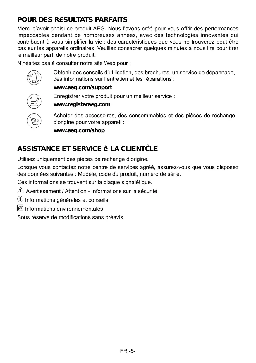 Merci d’avoir choisi ce produit AEG. Nous l’avons créé pour vous offrir des performances impeccables pendant de nombreuses années, avec des technologies innovantes qui contribuent à vous simplifier la vie : des caractéristiques que vous ne trouverez peut-être pas sur les appareils ordinaires. Veuillez consacrer quelques minutes à nous lire pour tirer le meilleur parti de notre produit. N’hésitez pas à consulter notre site Web pour : Obtenir des conseils d’utilisation, des brochures, un service de dépannage, des informations sur l’entretien et les réparations : www.aeg.com/support Enregistrer votre produit pour un meilleur service : www.registeraeg.com Acheter des accessoires, des consommables et des pièces de rechange d’origine pour votre appareil : www.aeg.com/shop