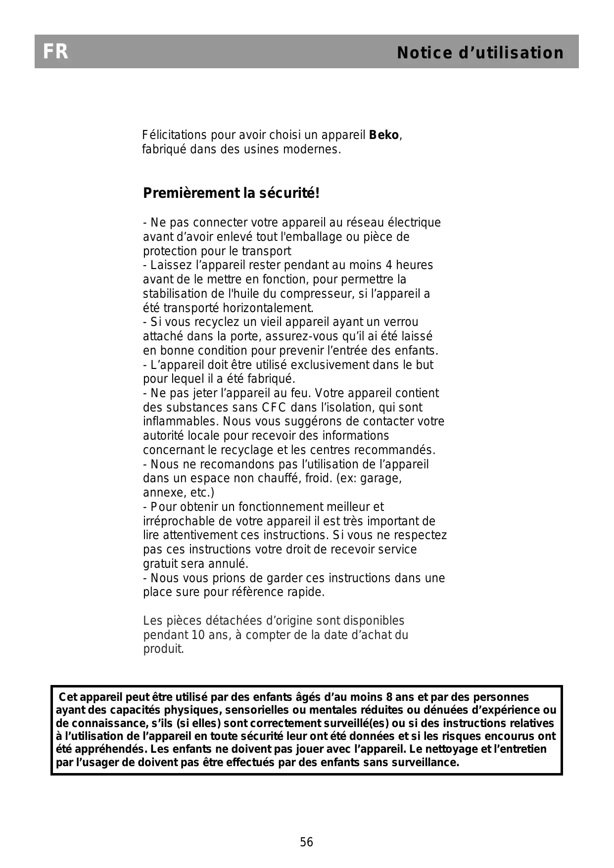 Notice d’utilisation Félicitations pour avoir choisi un appareil Beko, fabriqué dans des usines modernes. Premièrement la sécurité! - Ne pas connecter votre appareil au réseau électrique avant d’avoir enlevé tout l'emballage ou pièce de protection pour le transport - Laissez l’appareil rester pendant au moins 4 heures avant de le mettre en fonction, pour permettre la stabilisation de l'huile du compresseur, si l’appareil a été transporté horizontalement. - Si vous recyclez un vieil appareil ayant un verrou attaché dans la porte, assurez-vous qu’il ai été laissé en bonne condition pour prevenir l’entrée des enfants. - L’appareil doit être utilisé exclusivement dans le but pour lequel il a été fabriqué. - Ne pas jeter l’appareil au feu. Votre appareil contient des substances sans CFC dans l’isolation, qui sont inflammables. Nous vous suggérons de contacter votre autorité locale pour recevoir des informations concernant le recyclage et les centres recommandés. - Nous ne recomandons pas l’utilisation de l’appareil dans un espace non chauffé, froid. (ex: garage, annexe, etc.) - Pour obtenir un fonctionnement meilleur et irréprochable de votre appareil il est très important de lire attentivement ces instructions. Si vous ne respectez pas ces instructions votre droit de recevoir service gratuit sera annulé. - Nous vous prions de garder ces instructions dans une place sure pour réfèrence rapide. Les pièces détachées d’origine sont disponibles pendant 10 ans, à compter de la date d’achat du produit. Cet appareil peut être utilisé par des enfants âgés d’au moins 8 ans et par des personnes ayant des capacités physiques, sensorielles ou mentales réduites ou dénuées d’expérience ou de connaissance, s’ils (si elles) sont correctement surveillé(es) ou si des instructions relatives à l’utilisation de l’appareil en toute sécurité leur ont été données et si les risques encourus ont été appréhendés. Les enfants ne doivent pas jouer avec l’appareil. Le nettoyage et l’entretien par l’usager de doivent pas être effectués par des enfants sans surveillance.