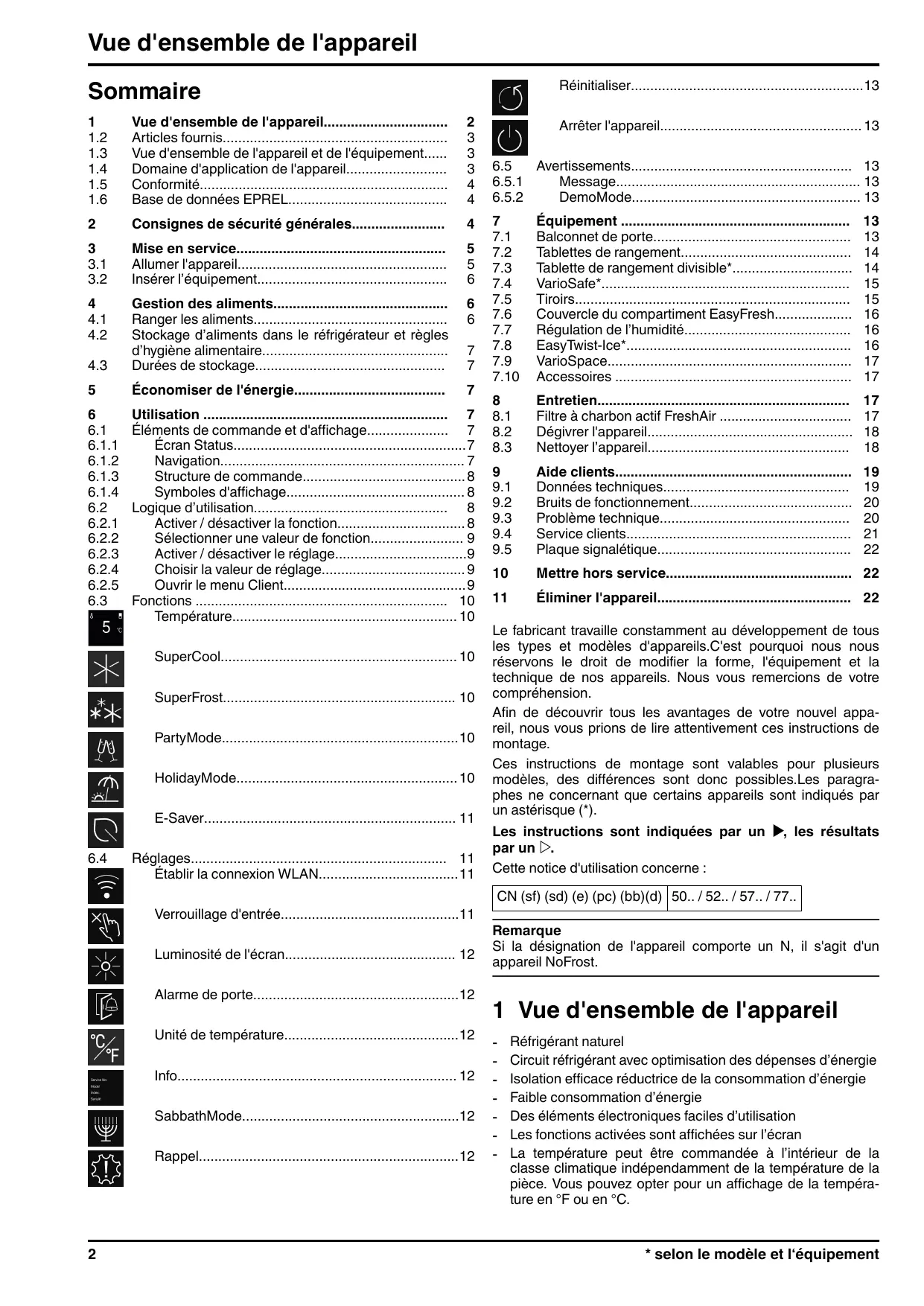 Vérifier l’absence d’avaries de transport sur toutes les pièces. En cas de réclamation, adressez-vous au revendeur ou au service clients (voir 9.4 Service clients) . La livraison est composée des pièces suivantes : - Appareil indépendant - Équipement (en fonction du modèle) - Matériel de montage (en fonction du modèle) - « Quick Start Guide » (10) Tiroir de congélation charbon actif FreshAir (3) Tablette de rangement (11) VarioSpace divisible* (4) Tablette de rangement (12) Plaque signalétique (5) VarioSafe* bres d'hôtes, des clients dans des maisons de campagne, des hôtels, des motels et autres structures d'accueil, - dans la restauration et les services similaires dans le commerce de gros. L'appareil n'est pas conçu pour être encastré. Toutes les autres utilisations sont interdites. Utilisations incorrectes prévisibles Les applications suivantes sont formellement interdites : - Stockage et refroidissement de médicaments, de plasma sanguin, de préparations de laboratoire ou autres matières ou produits similaires régis par la directive en matière de dispositifs médicaux 2007/47/CE - Utilisation dans des zones à risque d'explosion - Utilisation sur des supports mobiles tels que navires, trains ou avions Une utilisation incorrecte de l'appareil peut causer la détérioration ou la pourriture de la marchandise stockée à l'intérieur. Classes climatiques L'appareil est conçu pour fonctionner à des températures ambiantes limitées selon la classe climatique. La classe climatique correspondant à votre appareil est indiquée sur la plaque signalétique. - par