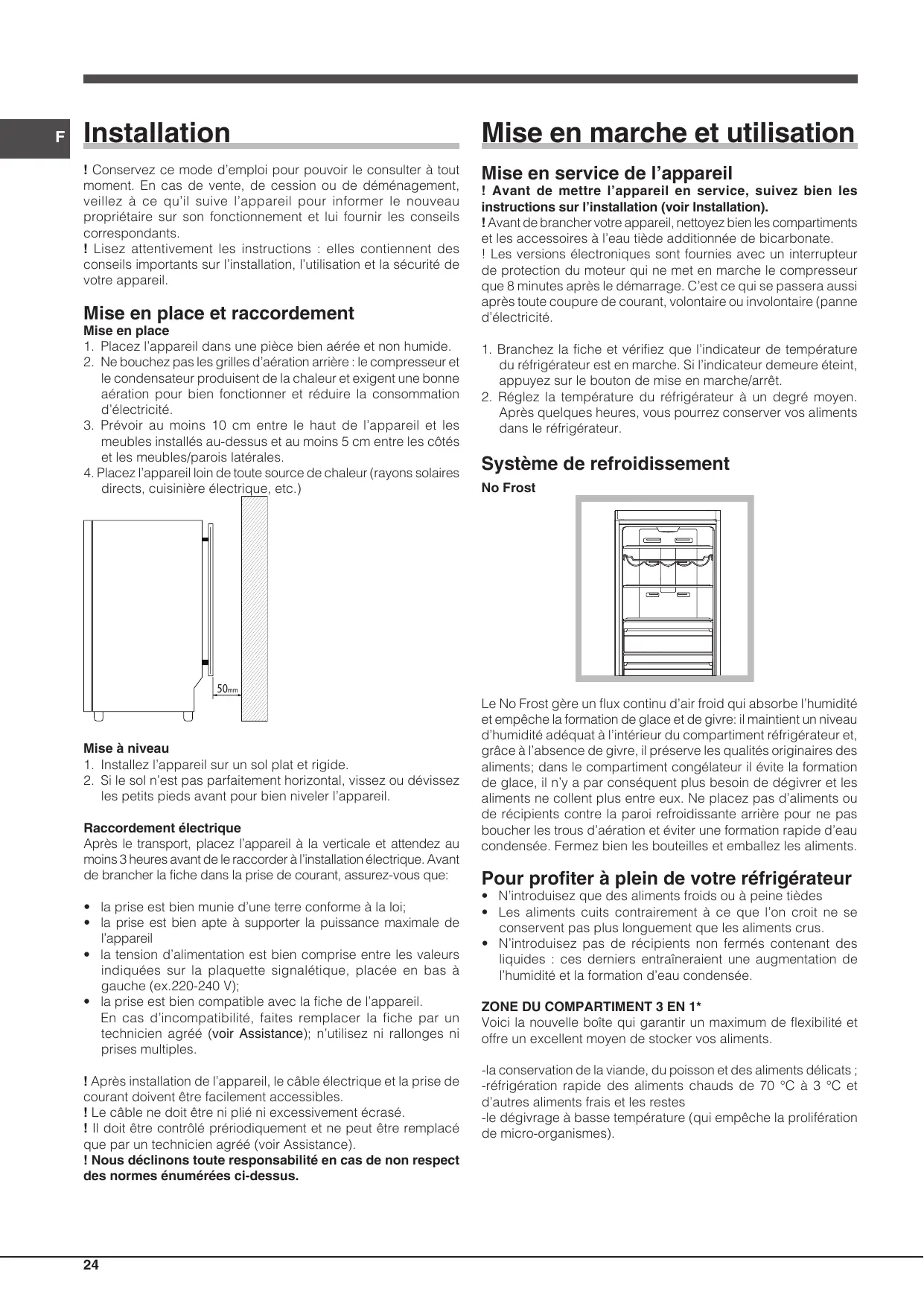 Mise à niveau 1. Installez l’appareil sur un sol plat et rigide. 2. Si le sol n’est pas parfaitement horizontal, vissez ou dévissez les petits pieds avant pour bien niveler l’appareil. Raccordement électrique Après le transport, placez l’appareil à la verticale et attendez au moins 3 heures avant de le raccorder à l’installation électrique. Avant de brancher la fiche dans la prise de courant, assurez-vous que: • la prise est bien munie d’une terre conforme à la loi; • la prise est bien apte à supporter la puissance maximale de l’appareil • la tension d’alimentation est bien comprise entre les valeurs indiquées sur la plaquette signalétique, placée en bas à gauche (ex.220-240 V); • la prise est bien compatible avec la fiche de l’appareil. En cas d’incompatibilité, faites remplacer la fiche par un technicien agréé (voir Assistance); n’utilisez ni rallonges ni prises multiples. ! Après installation de l’appareil, le câble électrique et la prise de courant doivent être facilement accessibles. ! Le câble ne doit être ni plié ni excessivement écrasé. ! Il doit être contrôlé prériodiquement et ne peut être remplacé que par un technicien agréé (voir Assistance). ! Nous déclinons toute responsabilité en cas de non respect des normes énumérées ci-dessus.