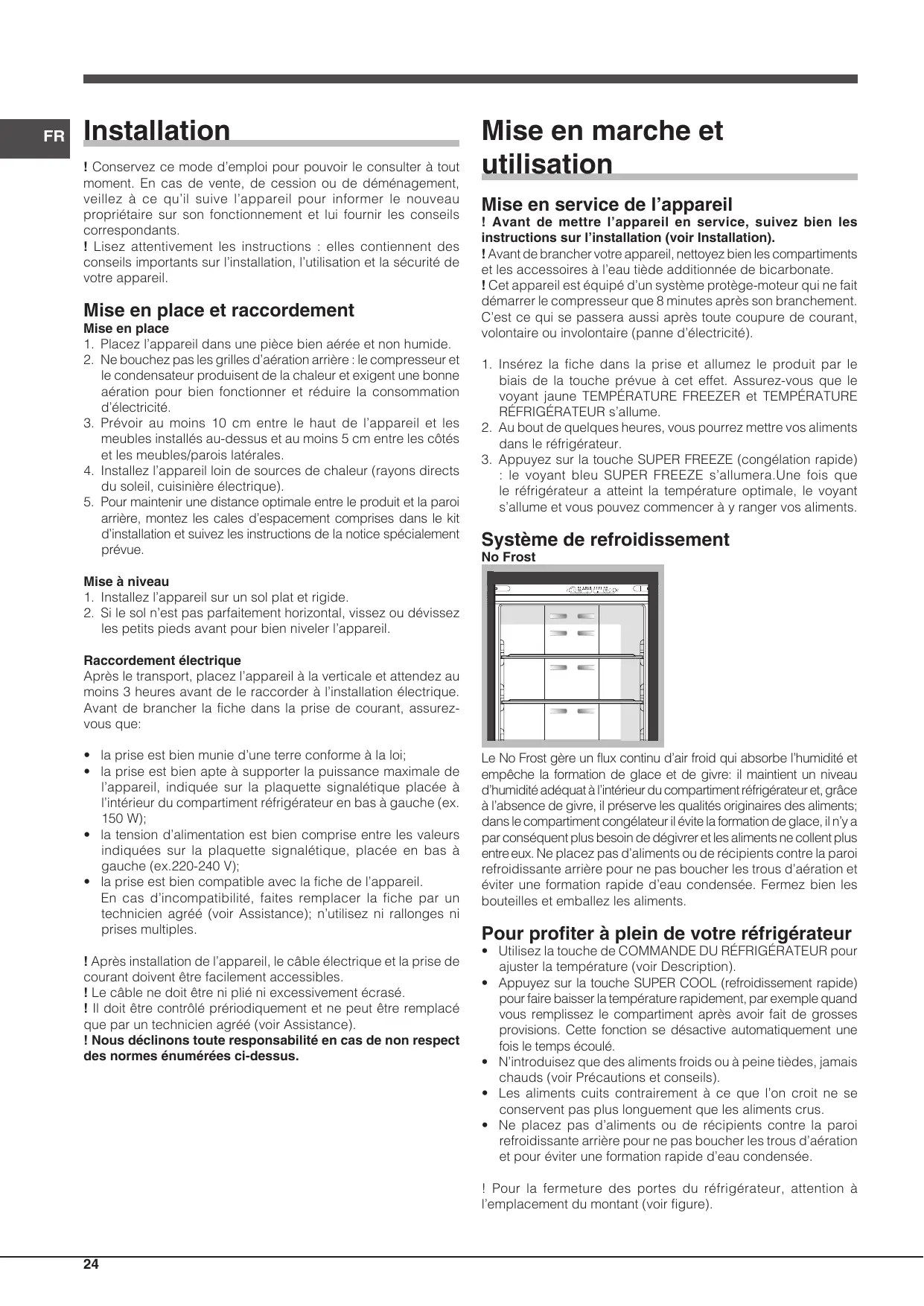 1. Installez l’appareil sur un sol plat et rigide. 2. Si le sol n’est pas parfaitement horizontal, vissez ou dévissez les petits pieds avant pour bien niveler l’appareil. Raccordement électrique Après le transport, placez l’appareil à la verticale et attendez au moins 3 heures avant de le raccorder à l’installation électrique. Avant de brancher la fiche dans la prise de courant, assurezvous que: • la prise est bien munie d’une terre conforme à la loi; • la prise est bien apte à supporter la puissance maximale de l’appareil, indiquée sur la plaquette signalétique placée à l’intérieur du compartiment réfrigérateur en bas à gauche (ex. 150 W); • la tension d’alimentation est bien comprise entre les valeurs indiquées sur la plaquette signalétique, placée en bas à gauche (ex.220-240 V); • la prise est bien compatible avec la fiche de l’appareil. En cas d’incompatibilité, faites remplacer la fiche par un technicien agréé (voir Assistance); n’utilisez ni rallonges ni prises multiples. ! Après installation de l’appareil, le câble électrique et la prise de courant doivent être facilement accessibles. ! Le câble ne doit être ni plié ni excessivement écrasé. ! Il doit être contrôlé prériodiquement et ne peut être remplacé que par un technicien agréé (voir Assistance). ! Nous déclinons toute responsabilité en cas de non respect des normes énumérées ci-dessus.