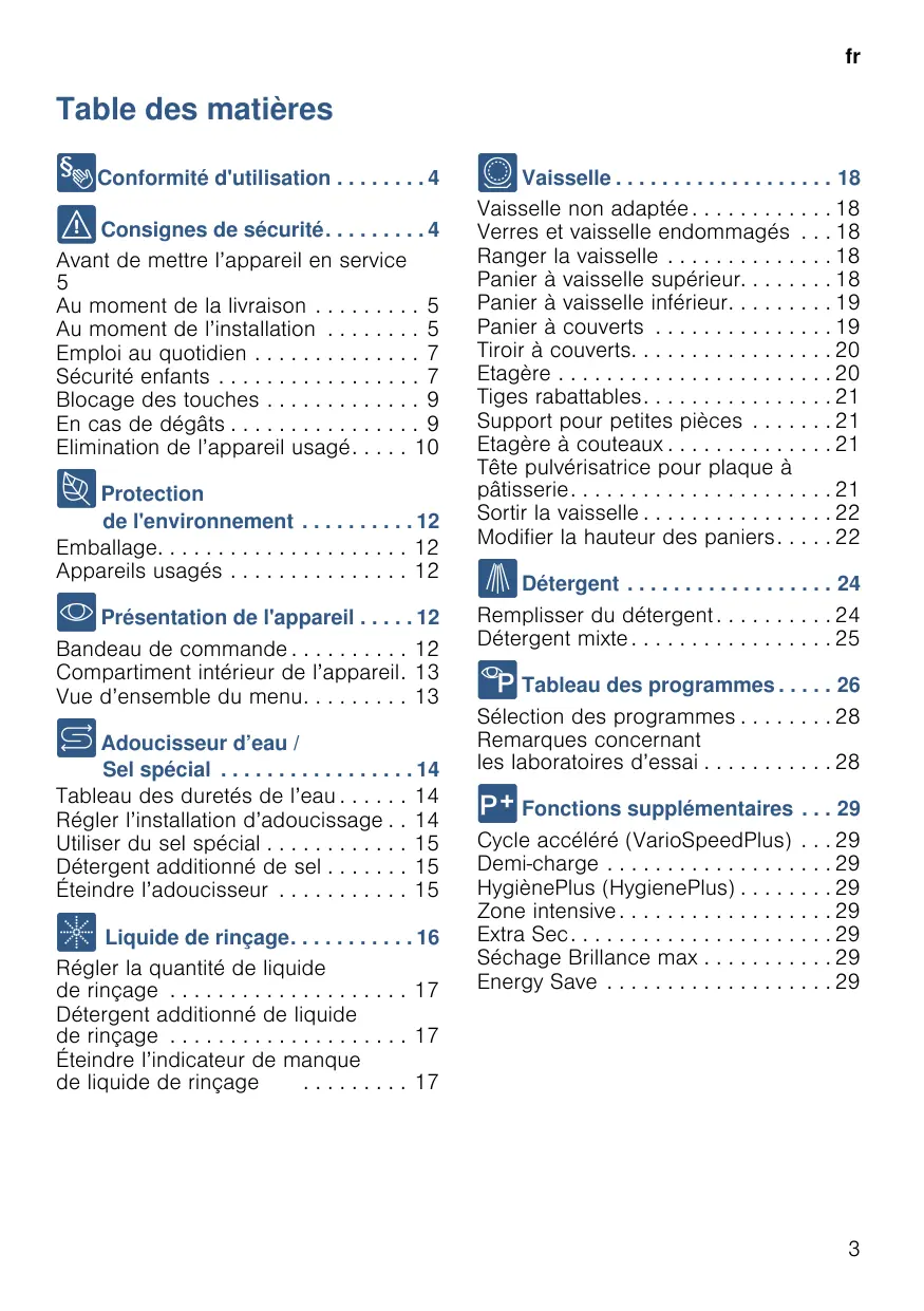 Détergent . . . . . . . . . . . . . . . . . . 24 Remplisser du détergent . . . . . . . . . . 24 Détergent mixte . . . . . . . . . . . . . . . . . 25 / Tableau des programmes . . . . . 26 Sélection des programmes . . . . . . . . 28 Remarques concernant les laboratoires d’essai . . . . . . . . . . . 28 0 Fonctions supplémentaires . . . 29 Cycle accéléré (VarioSpeedPlus) Demi-charge . . . . . . . . . . . . . . . . HygiènePlus (HygienePlus) . . . . . Zone intensive . . . . . . . . . . . . . . . Extra Sec . . . . . . . . . . . . . . . . . . . Séchage Brillance max . . . . . . . . Energy Save . . . . . . . . . . . . . . . .
