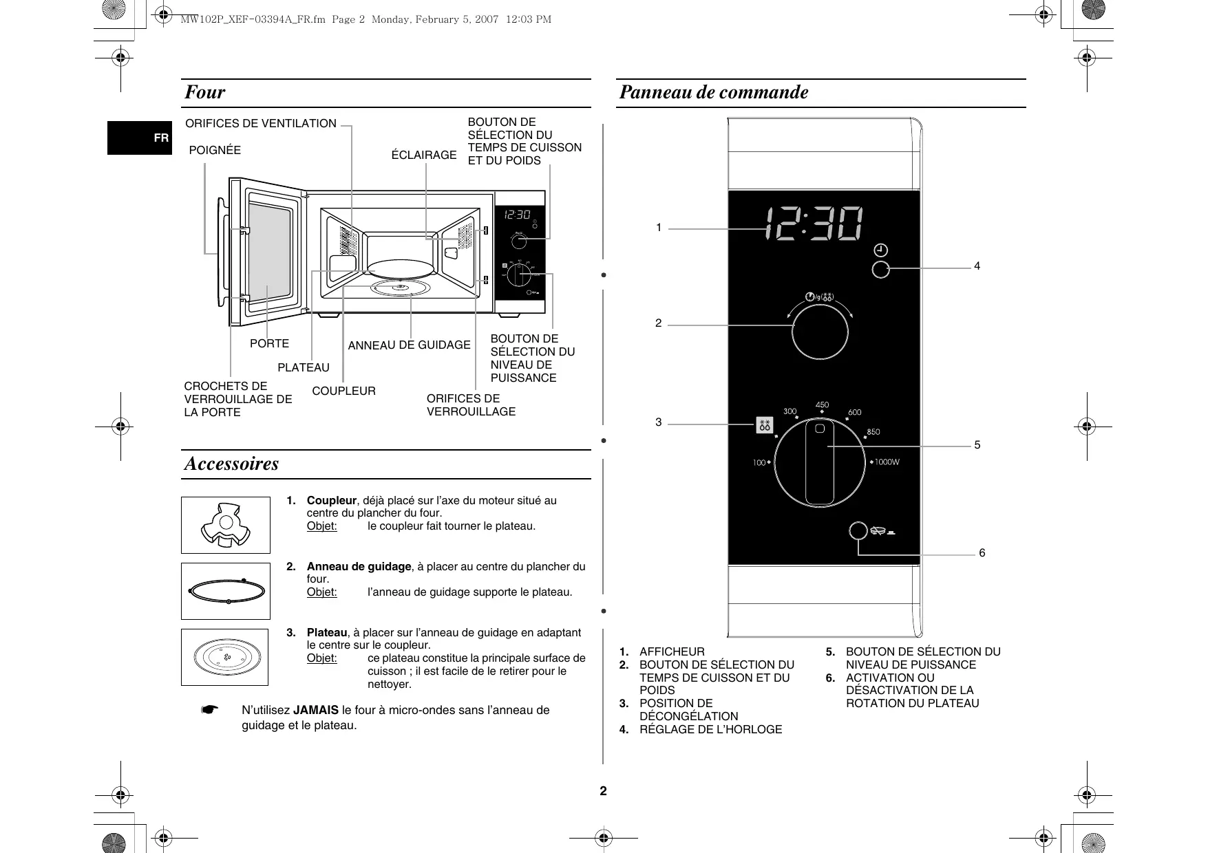 N’utilisez JAMAIS le four à micro-ondes sans l’anneau de guidage et le plateau.