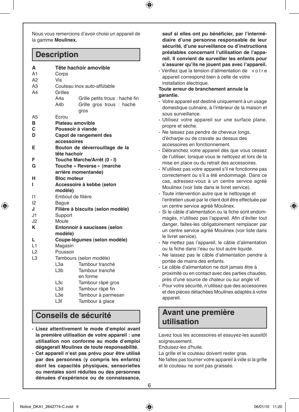 A5 Ecrou B Plateau amovible C Poussoir à viande D Capot de rangement des accessoires E Bouton de déverrouillage de la tête hachoir F Touche Marche/Arrêt (0 - I) G Touche « Reverse » (marche arrière momentanée) H Bloc moteur I Accessoire à kebbe (selon modèle) I1 Embout de filière I2 Bague J Filière à biscuits (selon modèle) J1 Support J2 Moule K Entonnoir à saucisses (selon modèle) L Coupe-légumes (selon modèle) L1 Magasin L2 Poussoir L3 Tambours (selon modèle) L3a Tambour tranché L3b Tambour tranché