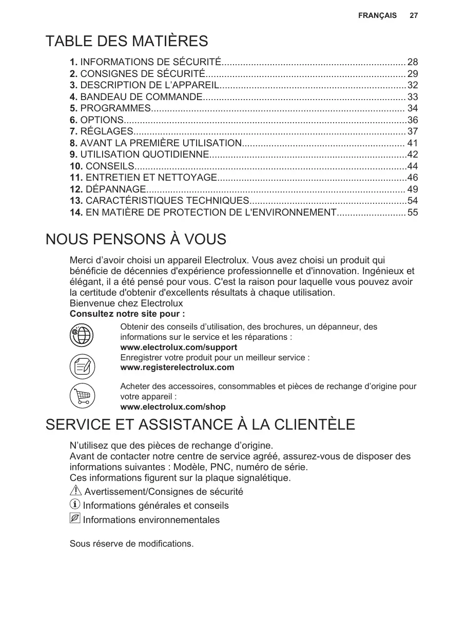Merci d’avoir choisi un appareil Electrolux. Vous avez choisi un produit qui bénéficie de décennies d'expérience professionnelle et d'innovation. Ingénieux et élégant, il a été pensé pour vous. C'est la raison pour laquelle vous pouvez avoir la certitude d'obtenir d'excellents résultats à chaque utilisation. Bienvenue chez Electrolux Consultez notre site pour : Obtenir des conseils d’utilisation, des brochures, un dépanneur, des informations sur le service et les réparations : www.electrolux.com/support Enregistrer votre produit pour un meilleur service : www.registerelectrolux.com Acheter des accessoires, consommables et pièces de rechange d’origine pour votre appareil : www.electrolux.com/shop
