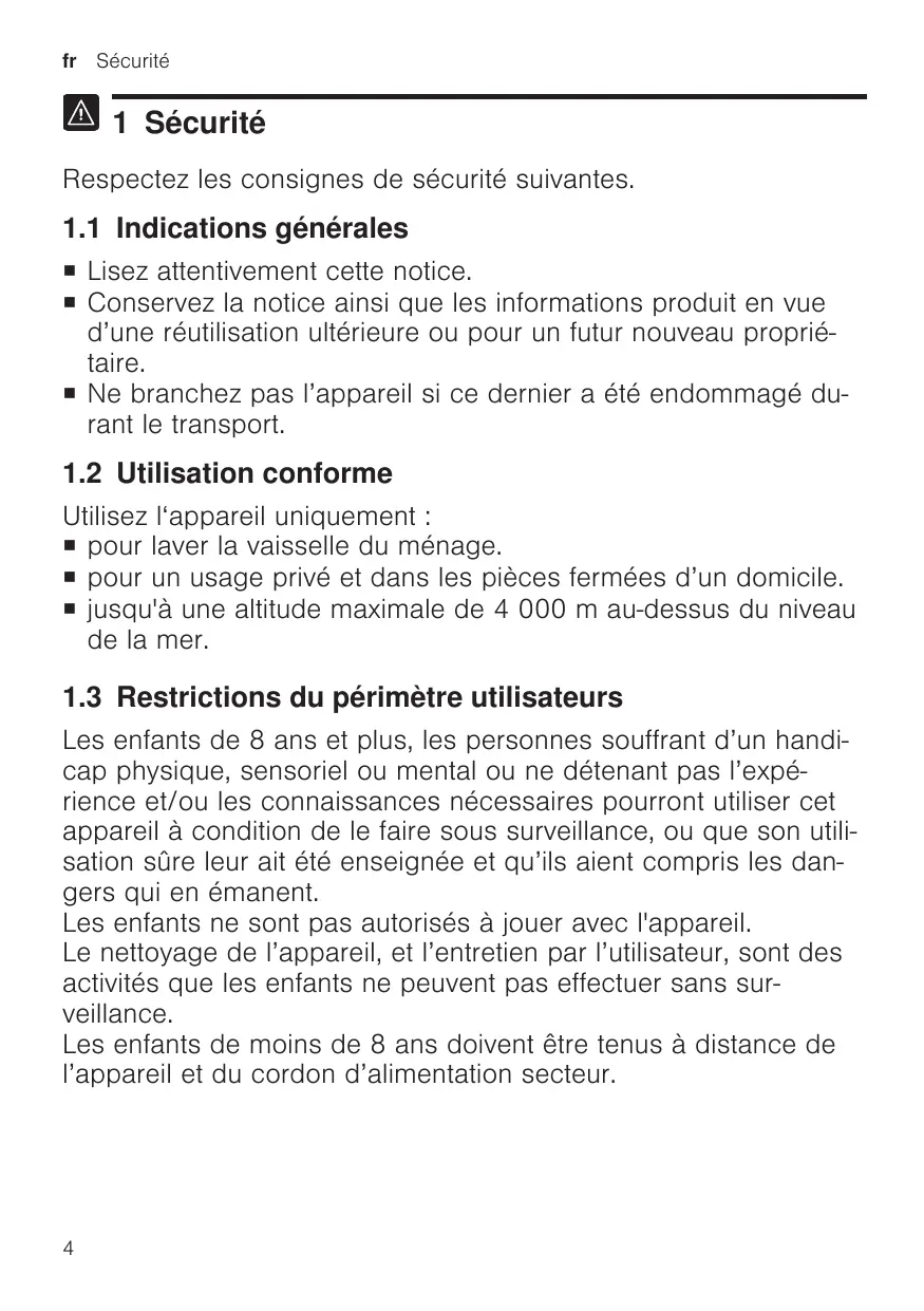 En plus des droits de garantie à l’encontre du revendeur établis dans le contrat de vente et de notre garantie du fabricant, nous assurons un dédommagement aux conditions suivantes. ¡ Si un défaut de notre système Aqua-Stop devait provoquer des dégâts des eaux, nous compensons les dommages subis par les consommateurs privés. Pour assurer la sécurité face au risque de dégâts des eaux, il faut que l’appareil soit raccordé au secteur électrique. ¡ Cette garantie-responsabilité vaut pour toute la durée de vie de l’appareil. ¡ Pour que la garantie soit valide, l’appareil doit être équipé d’un l’Aqua-Stop installé et raccordé professionnellement ; cette condition inclut aussi le montage professionnel d’une rallonge pour AquaStop (accessoire d’origine). Notre garantie ne couvre pas les conduites d’alimentation ou la robinetterie défectueuses jusqu’au raccord de l’Aqua-Stop sur le robinet d’eau. ¡ Appareils équipés de l’Aqua-Stop : vous n’aurez par définition pas à les surveiller pendant la marche, ou à fermer ensuite le robinet d’eau pour les protéger. Si vous devez vous absenter de votre domicile pendant plusieurs semaines, par ex. pour des vacances, fermez le robinet d’arrivée d’eau. Caractéristiques techniques fr 21 Caractéristiques techniques Poids Tension Puissance raccordée Protection par fusible Pression de l’eau Débit d’arrivée d’eau Température de l’eau Volume Max. : 60 kg 220–240 V, 50 Hz ou 60 Hz 2 000 - 2 400 W