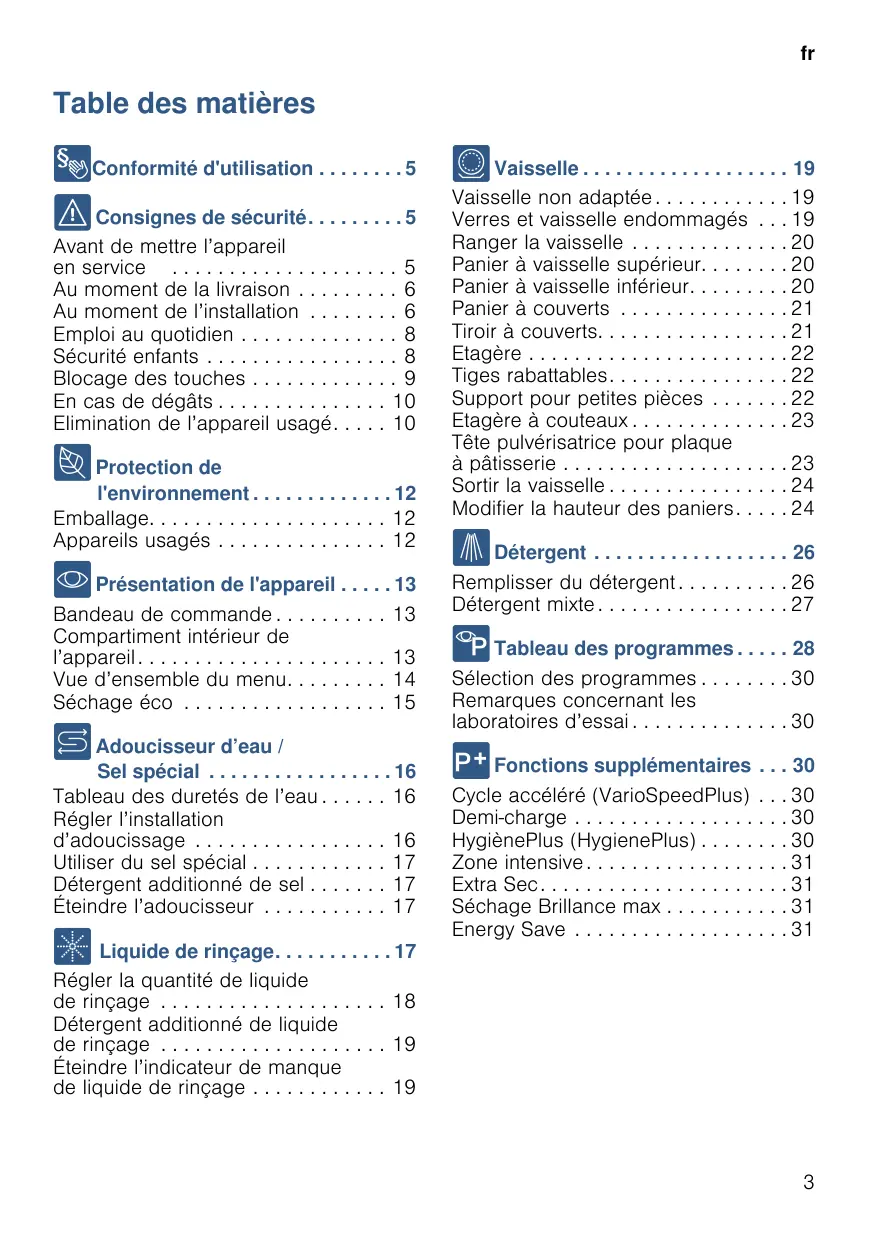 - ( Consignes de sécurité Avant de mettre l’appareil en service Au moment de la livraison Au moment de l’installation Emploi au quotidien Sécurité enfants Blocage des touches En cas de dégâts Elimination de l’appareil usagé. p. 5